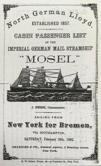 Otto Dahl nahm vor 136 Jahren den 1869 in Dienst gestellte Dampfer „Donau“ des Norddeutschen Lloyd mit einer im Vergleich zu heutigen Schiffen vergleichsweise winzigen Tonnage von 2.896 Bruttoregistertonnen. Zurück von New York nach Bremerhaven ging es auf der auch nicht größeren „Mosel“ – das Bild zeigt das Cover der Passagierliste. Zusammen mit Otto Dahl fuhren 35 weitere Passagiere mit der „Mosel“ von New York zurück nach Deutschland.