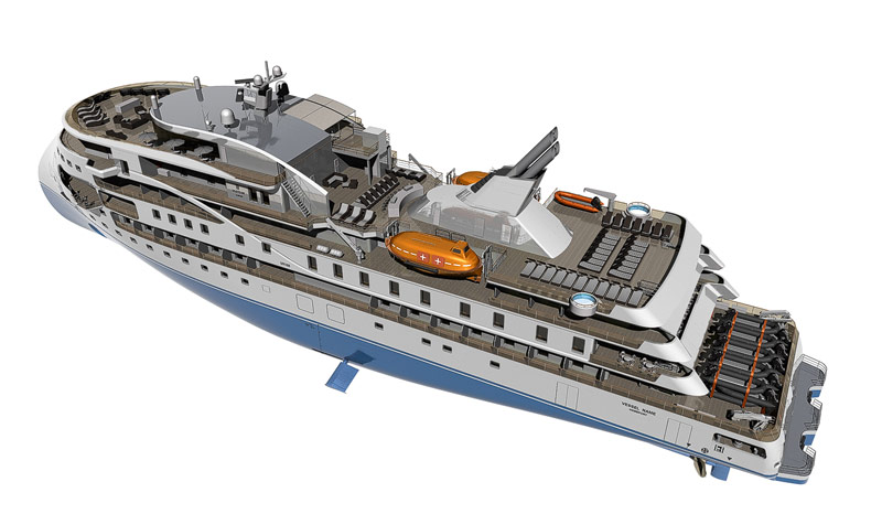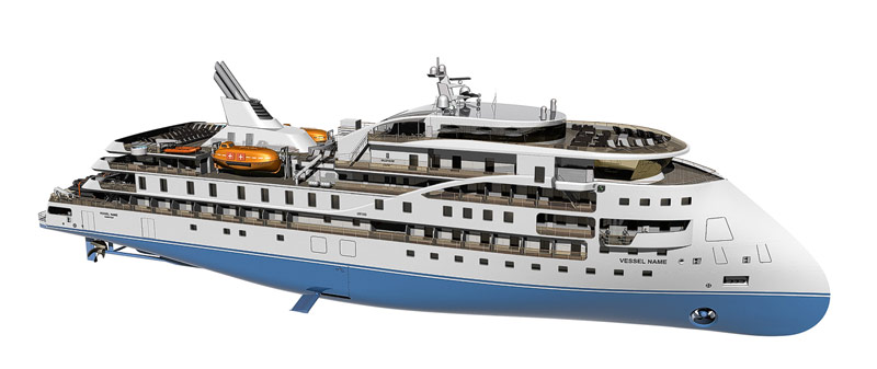 Das besondere an den geplanten Schiffen ist die für Expeditionskreuzfahrtschiffe bislang noch nie benutzte Bugform eines X-Bow, also eines deutlich negativen und relativ breiten Bugs.