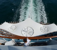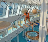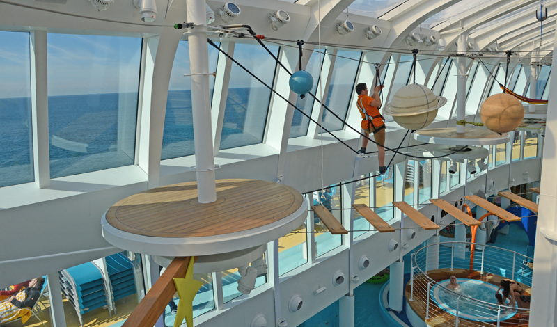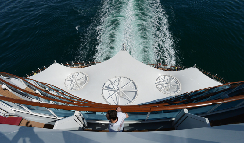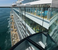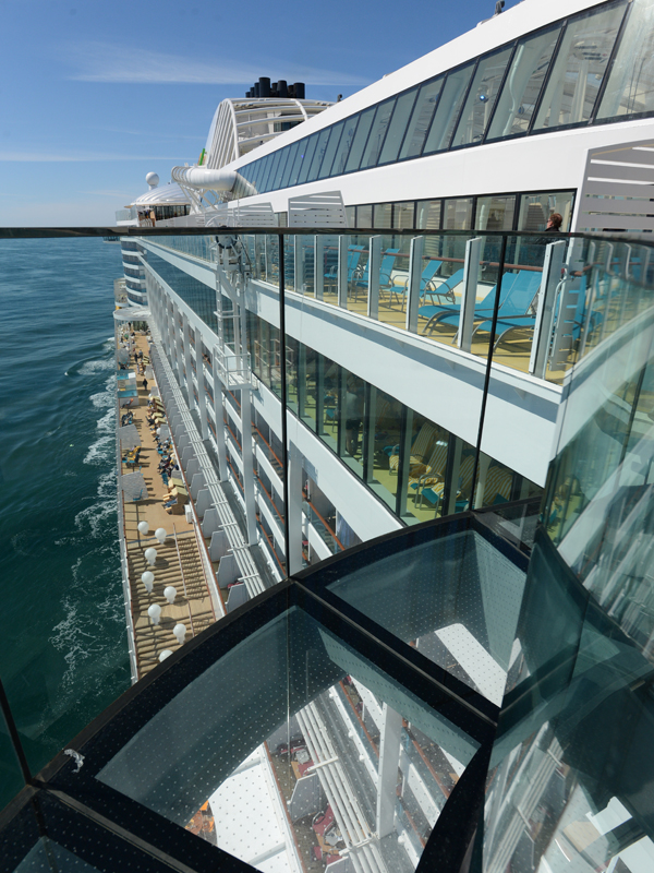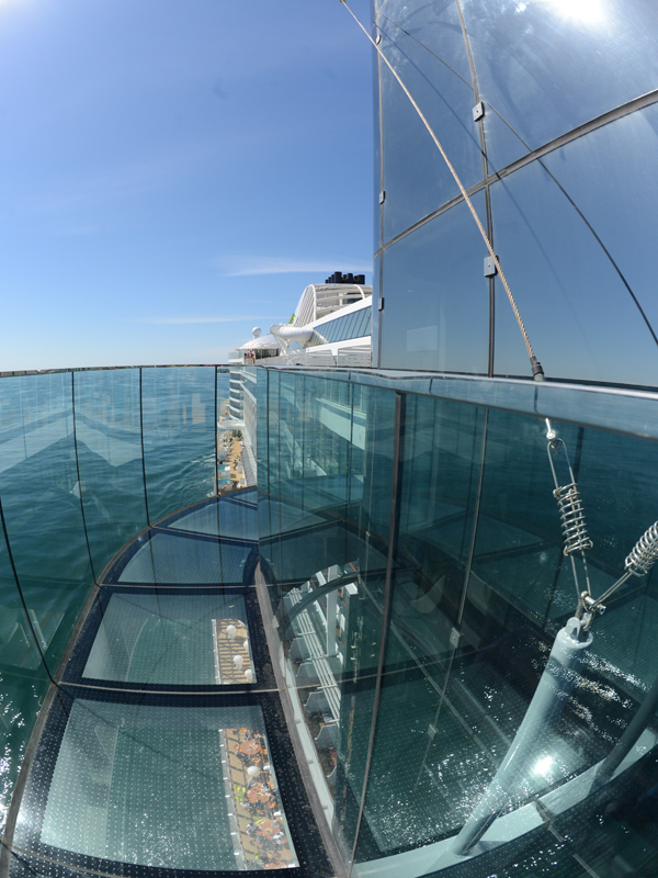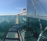 Am nächsten Morgen heißt es früh aufstehen, wenn man wirklich alle Ecken des Schiffes entdecken möchte. Uns zog es zunächst erneut auf Deck 15, bei strahlendem Sonnenschein wollten wir unbedingt den Skywalk umrunden. Hier steht man auf einem Glasboden direkt über dem neuen Lanai-Deck und dem Meer.
