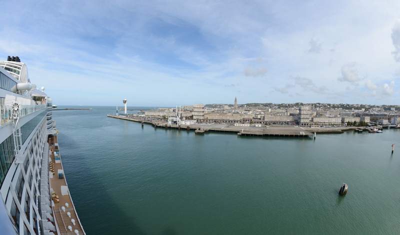 Stattdessen ging der heutige Ausflug ins nur 30 Minuten entfernte Honfleur. Dadurch hatten wir am Vormittag viel Zeit und konnten den Tag gemütlich angehen. Zeit, die wir zu einem ausgiebigen Frühstück im Fuego-Restaurant auf Deck 14 mit Blick über den Hafen gut zu nutzen wussten. Den Rest des Vormittags blieb Zeit, ein paar beeindruckende Hafenpanoramen zu fotografieren.