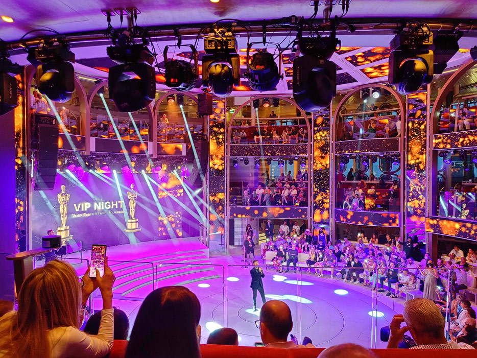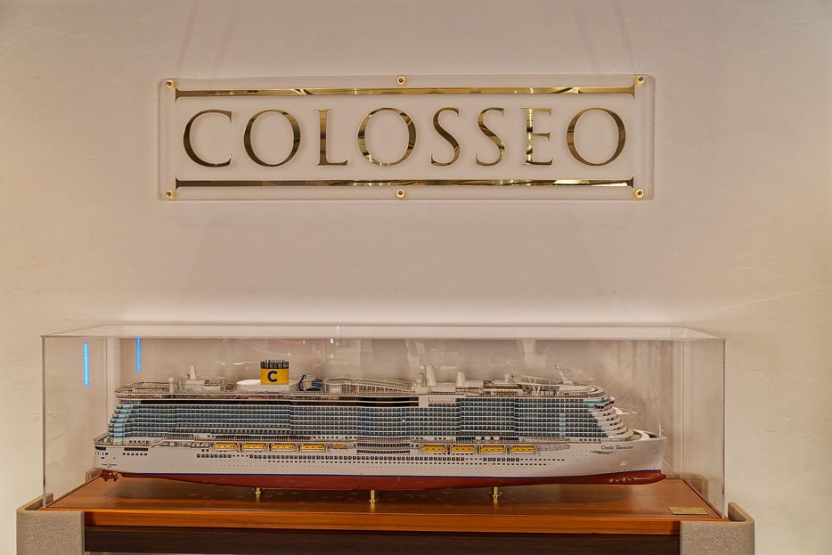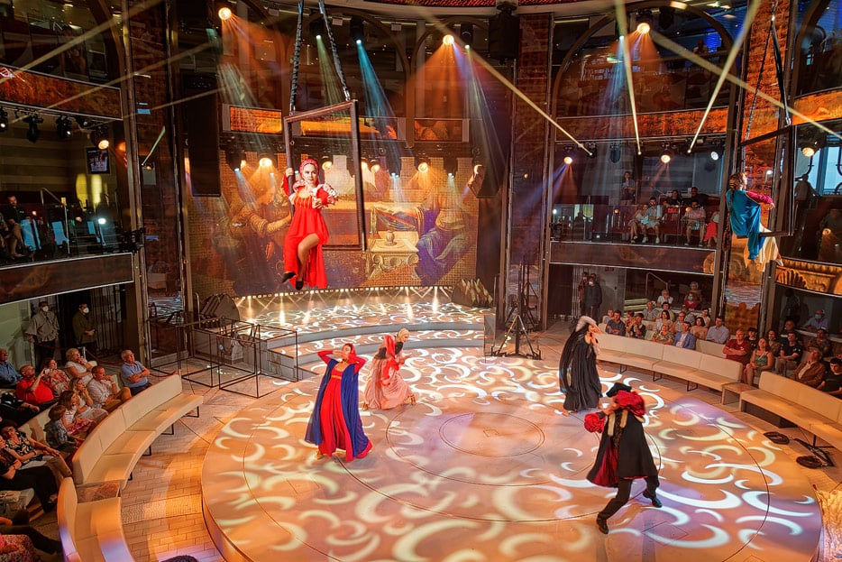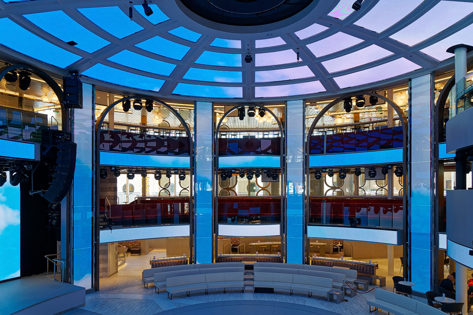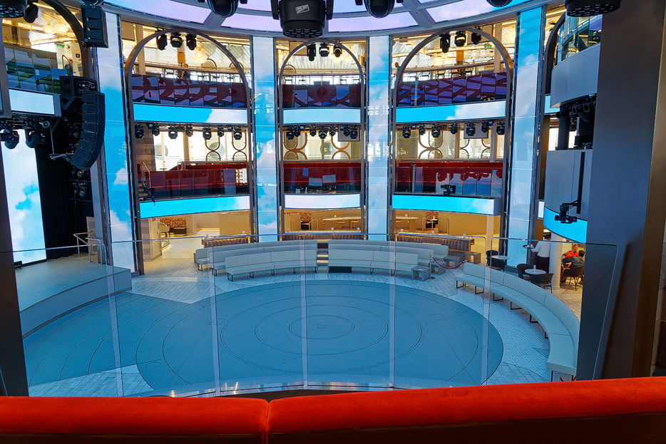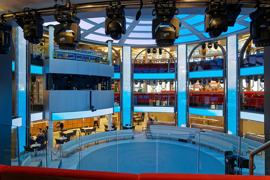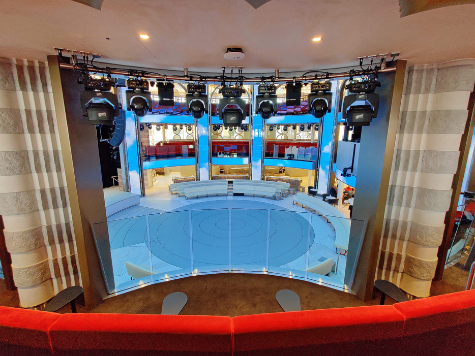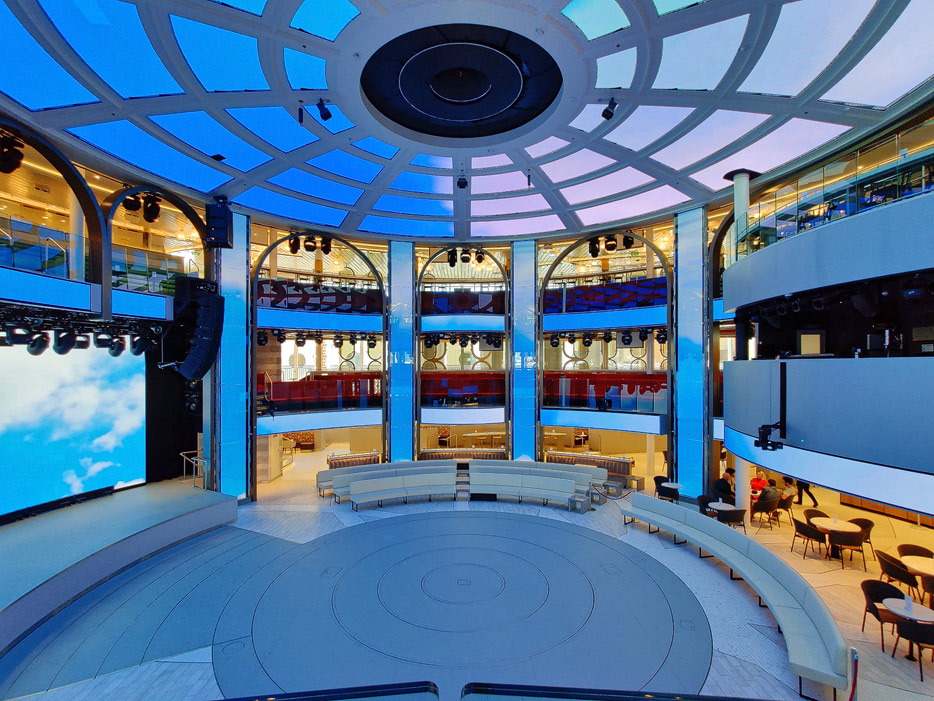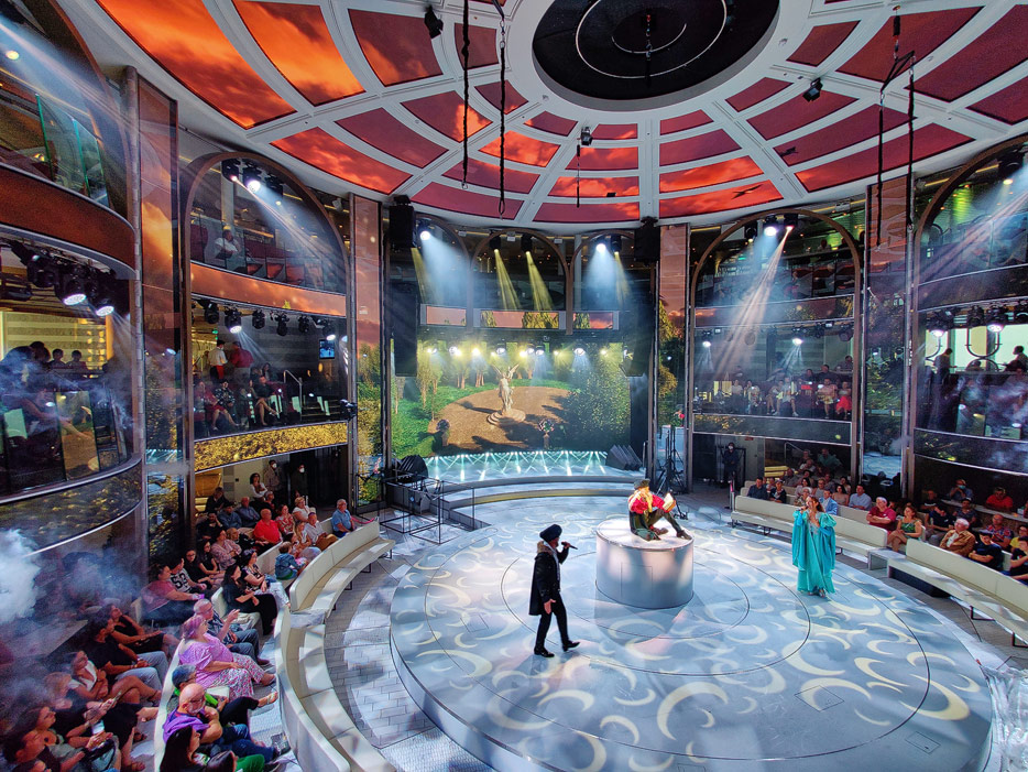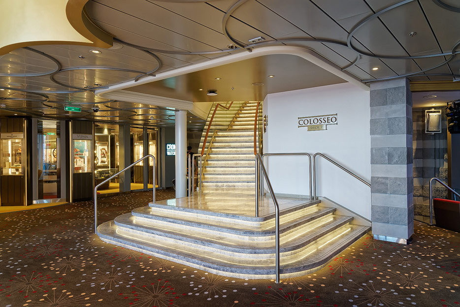 Bilder der Entertainment-Bereiche Theater Arena Poltrona Frau und Atrium Colosseo der Costa Toscana