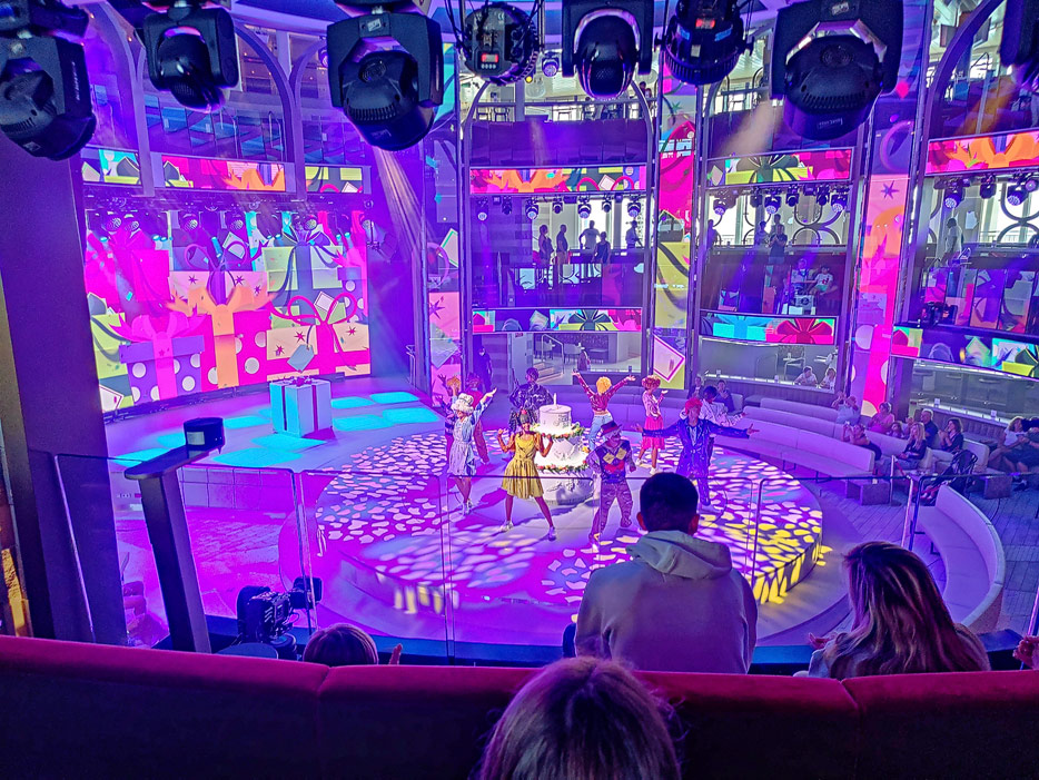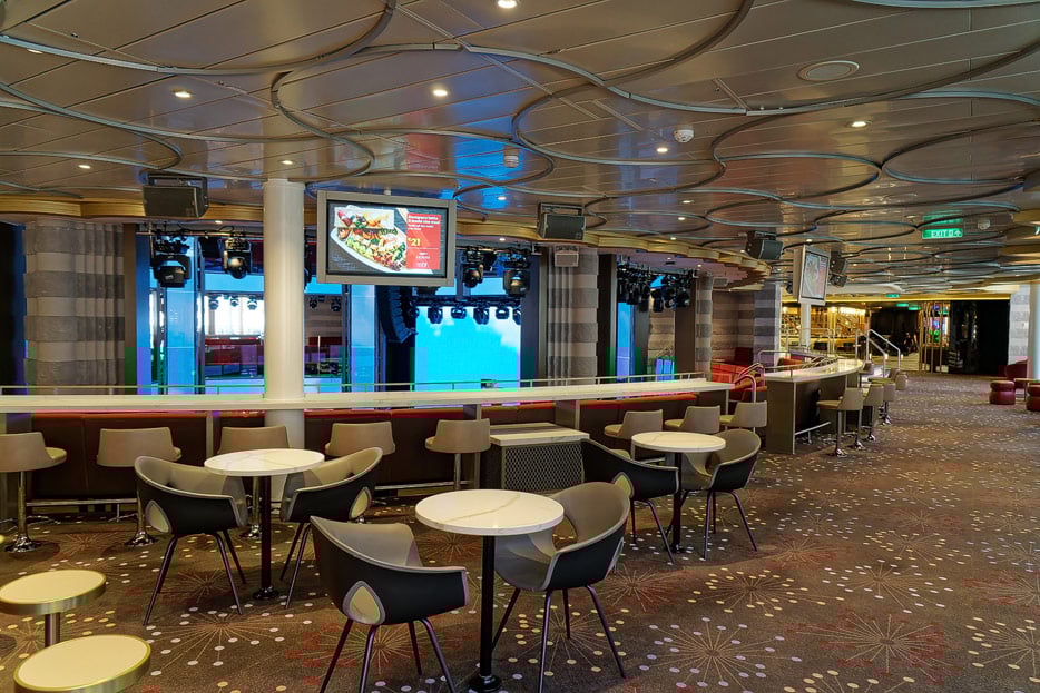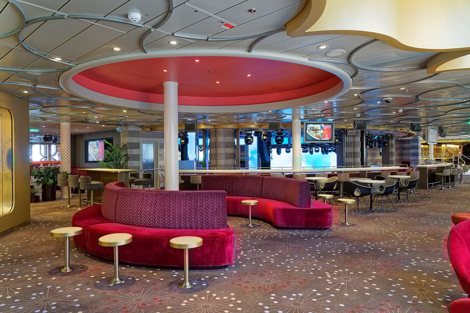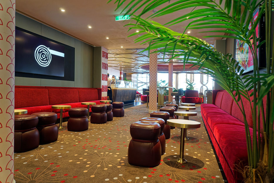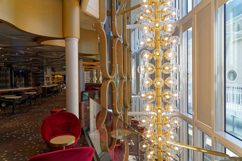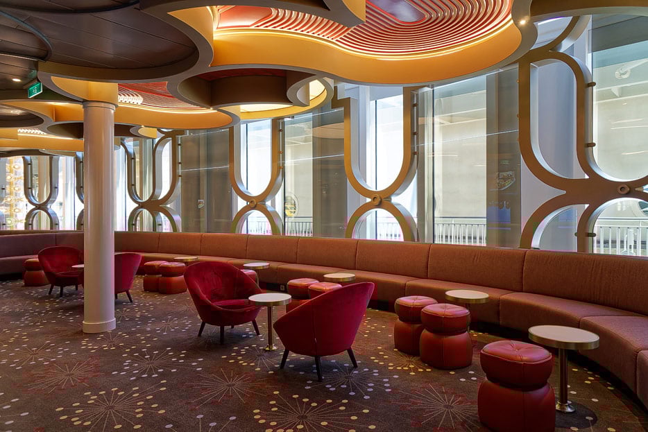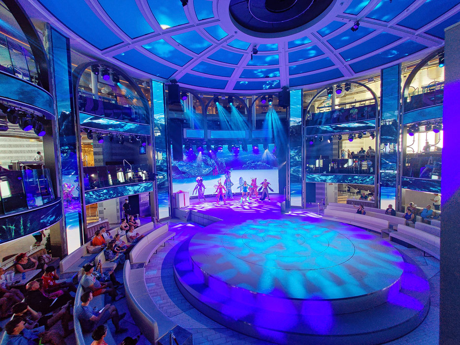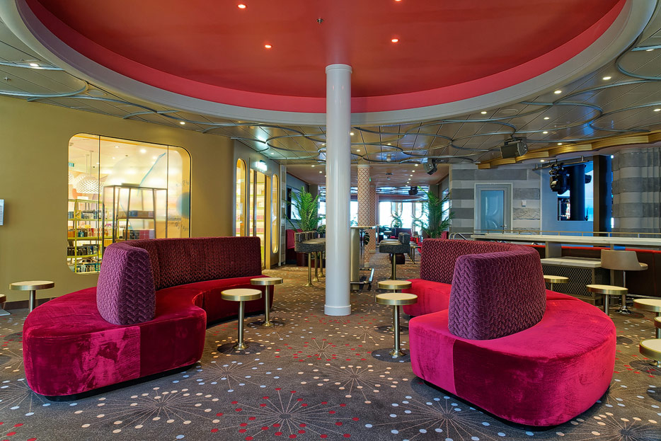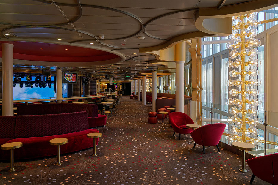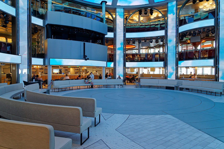 Bilder der Entertainment-Bereiche Theater Arena Poltrona Frau und Atrium Colosseo der Costa Toscana