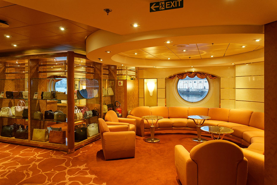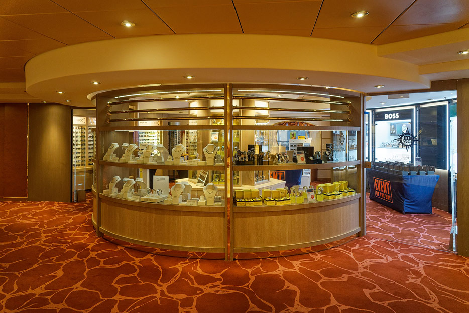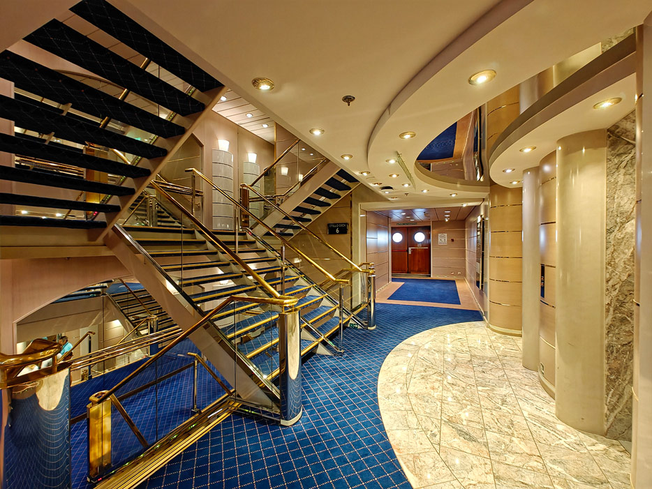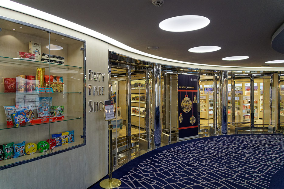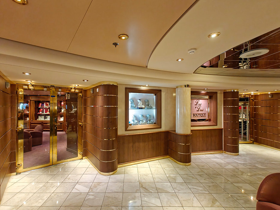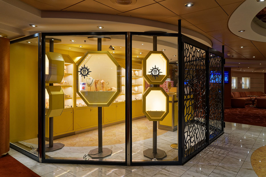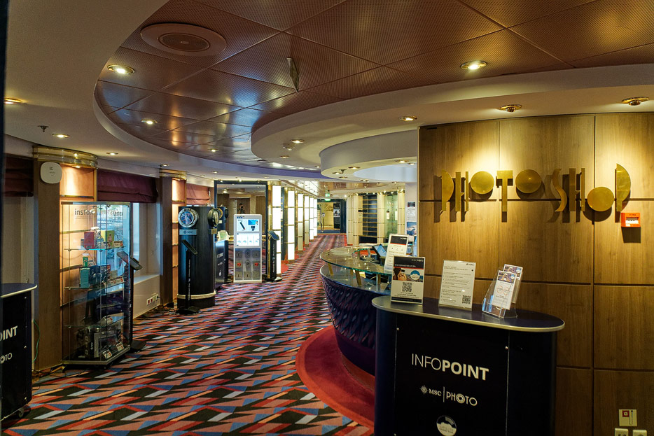 Bilder sonstiger Bereiche auf der MSC Opera: Atrium, Internet-Cafe und Bibliothek, Casino, Shops, Treppenhaus