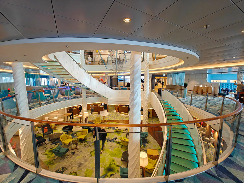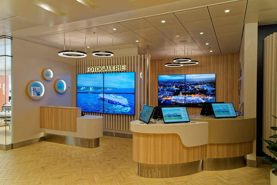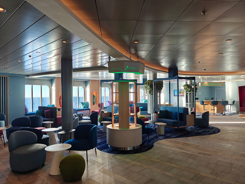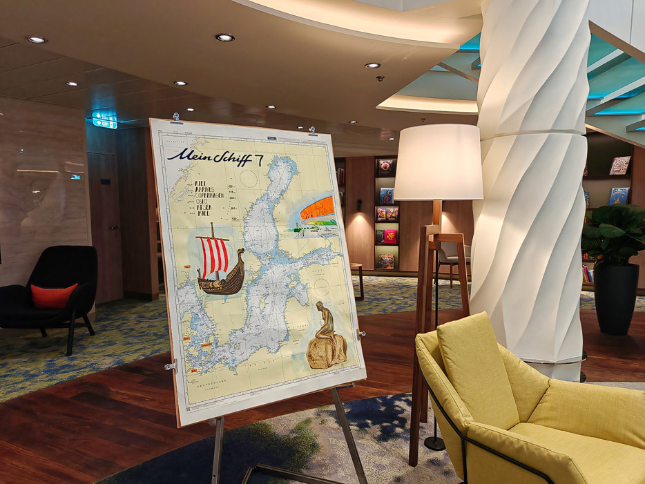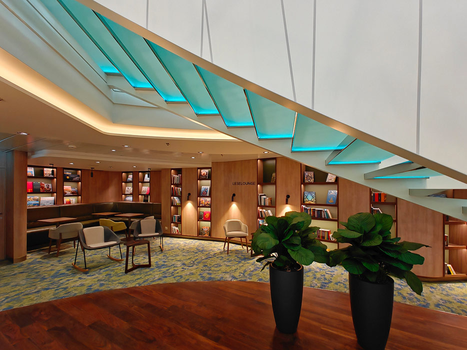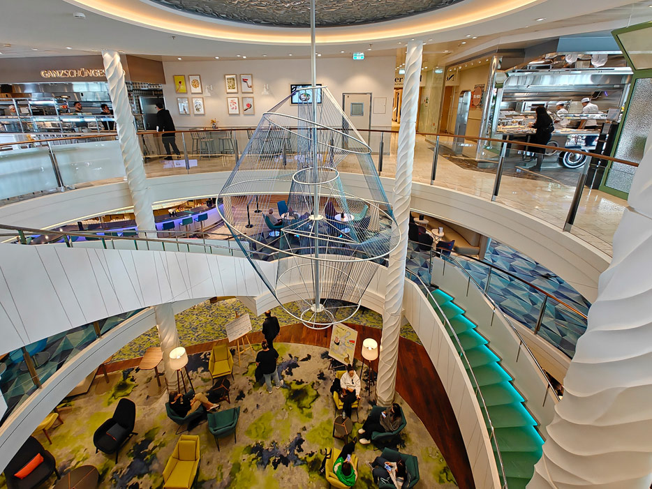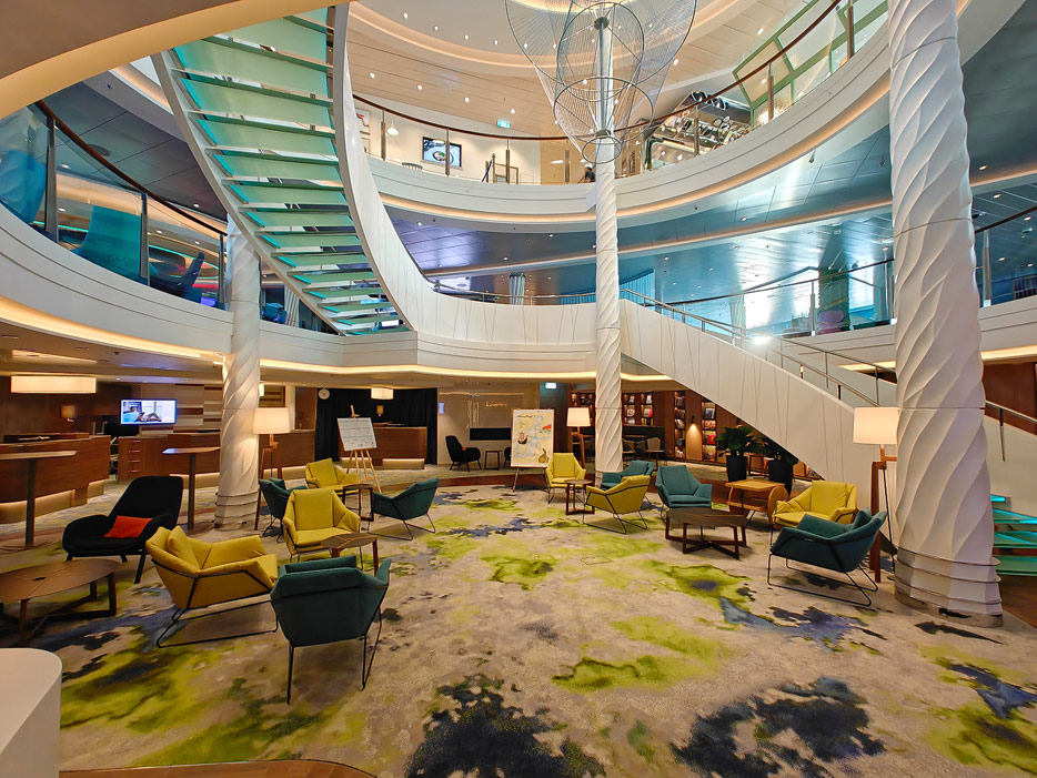 Bilder weiterer Bereiche der Mein Schiff 7, u.a. Atrium, Rezeption, Leselounge, Treppenhaus und Aufzüge