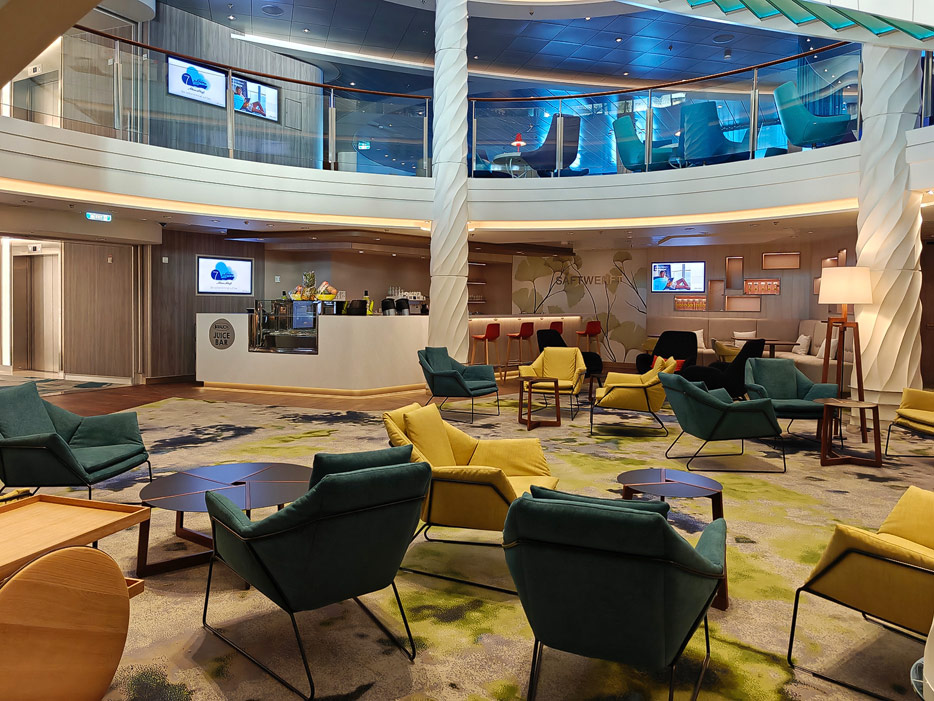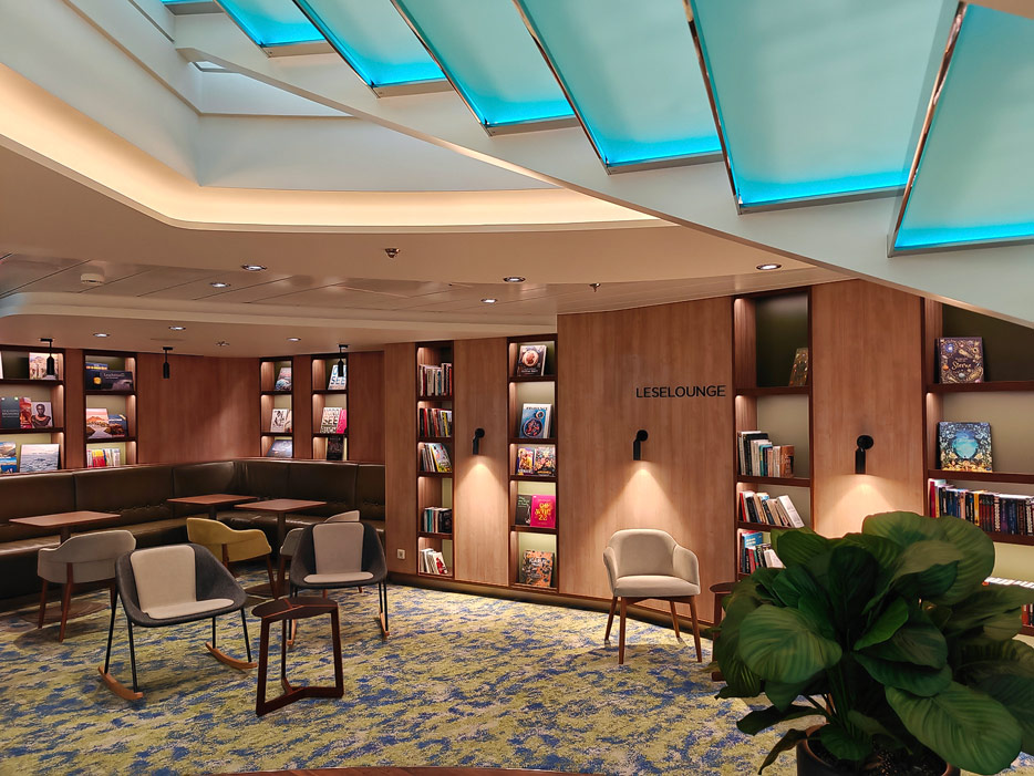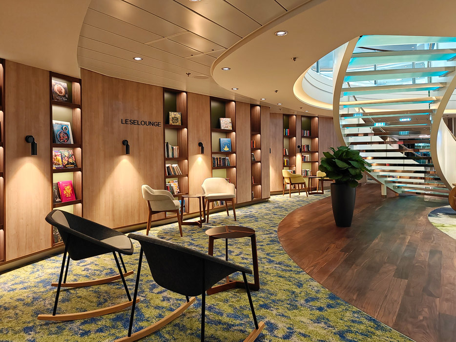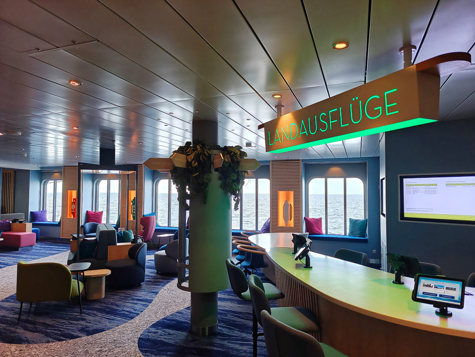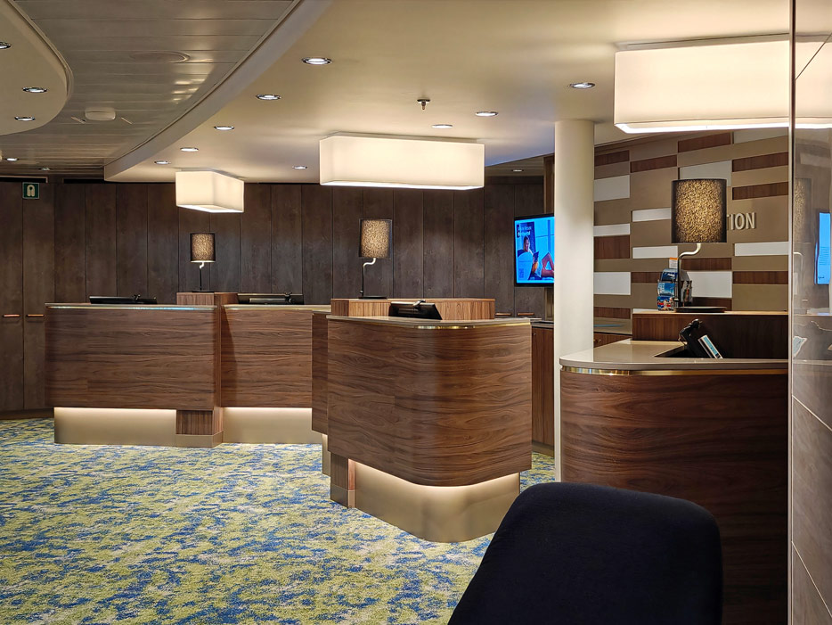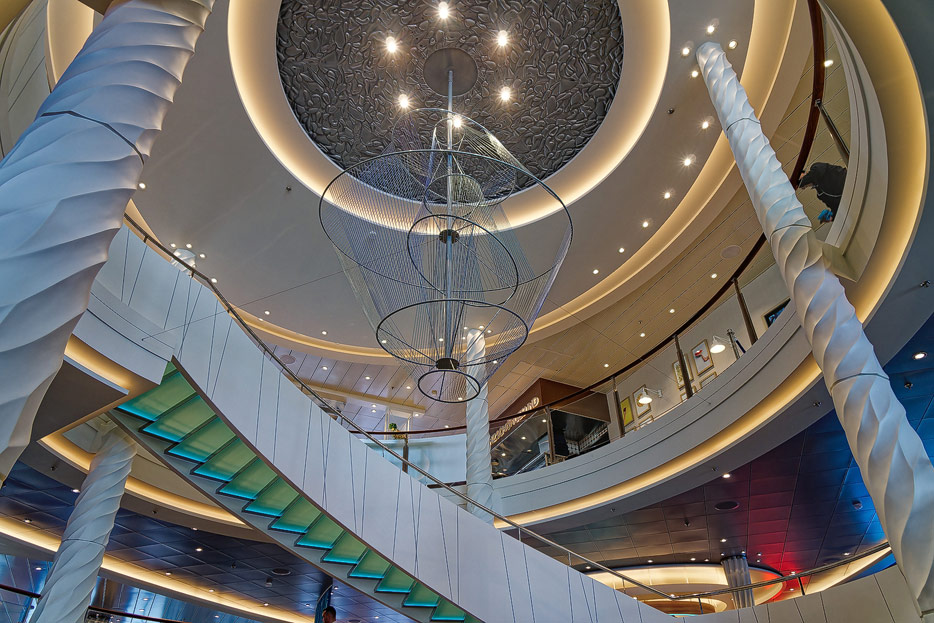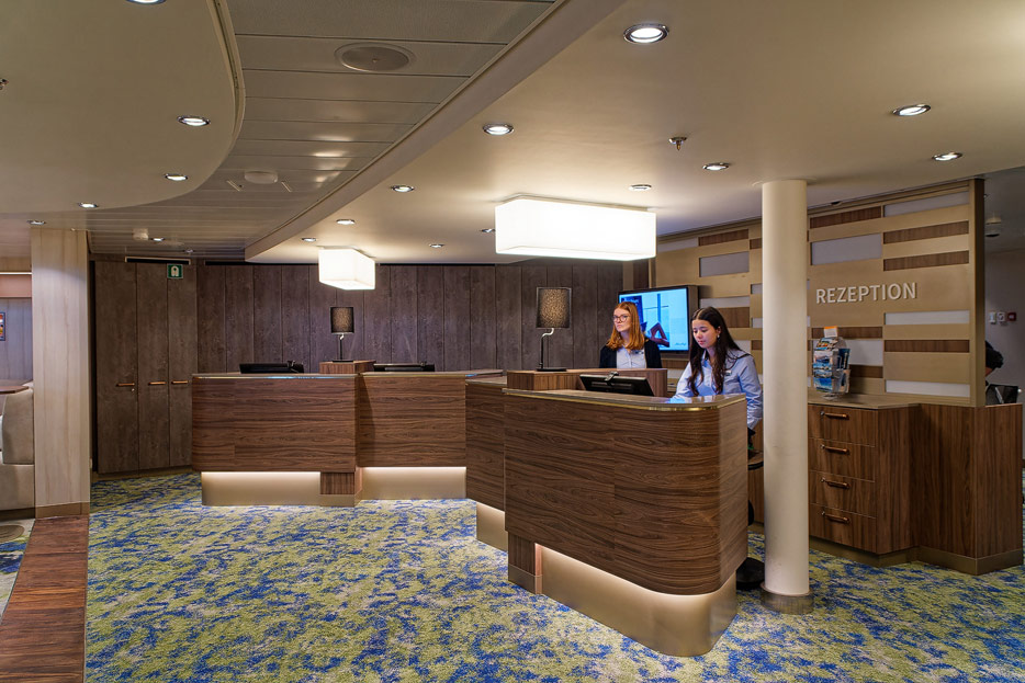 Bilder weiterer Bereiche der Mein Schiff 7, u.a. Atrium, Rezeption, Leselounge, Treppenhaus und Aufzüge
