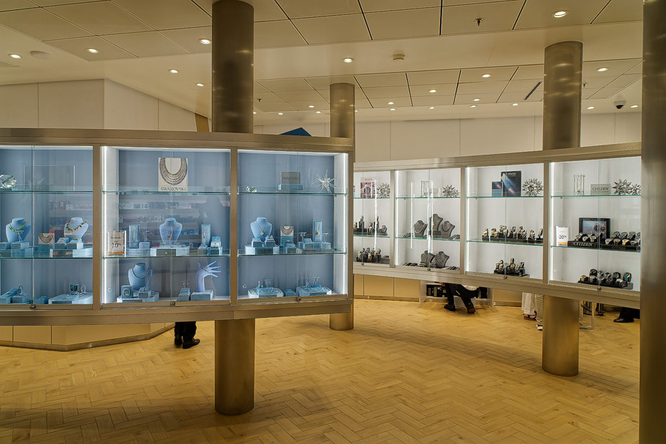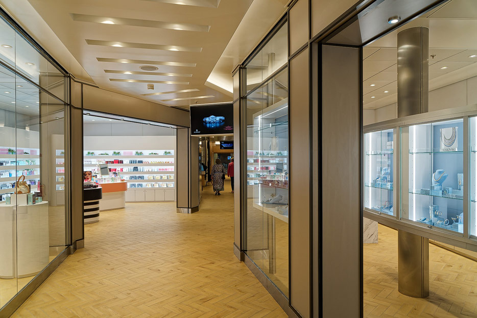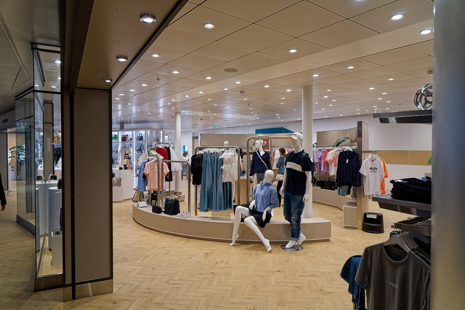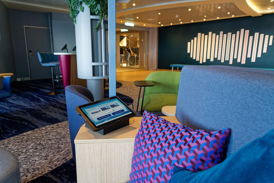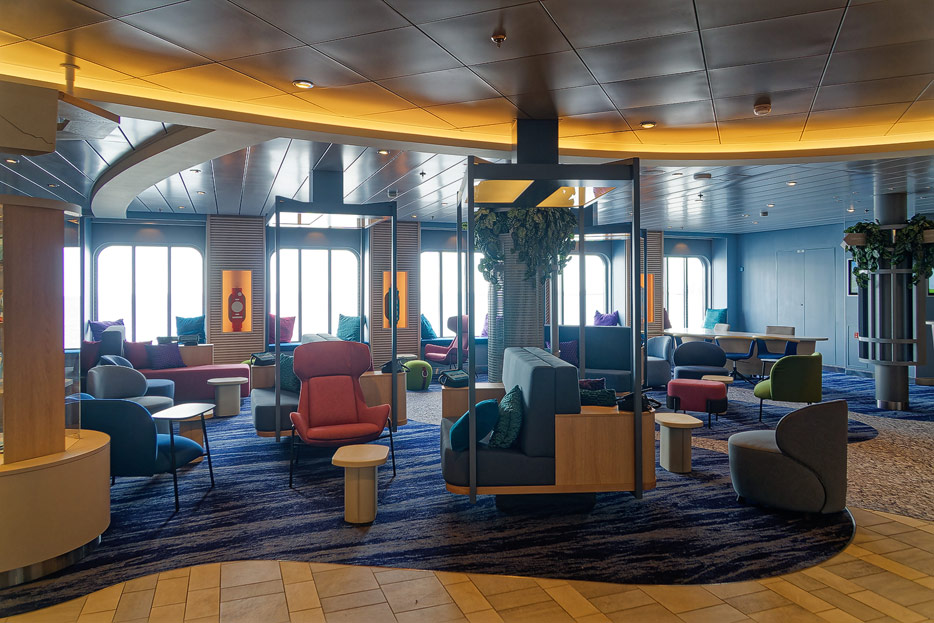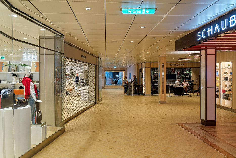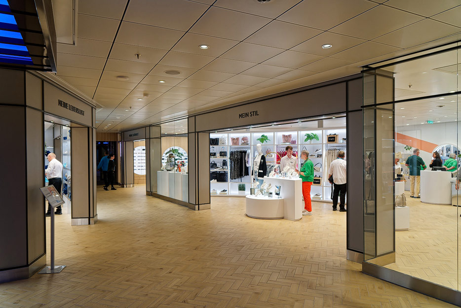 Bilder weiterer Bereiche der Mein Schiff 7, u.a. Atrium, Rezeption, Leselounge, Treppenhaus und Aufzüge