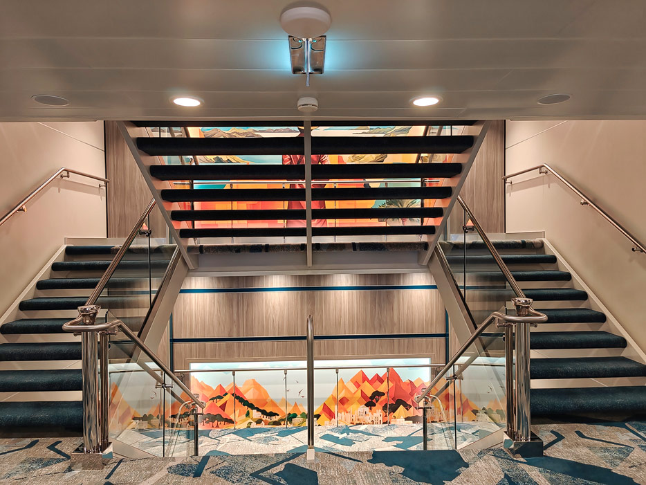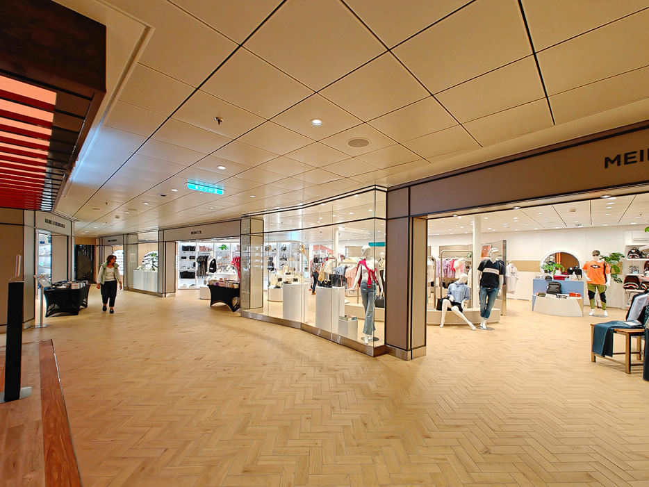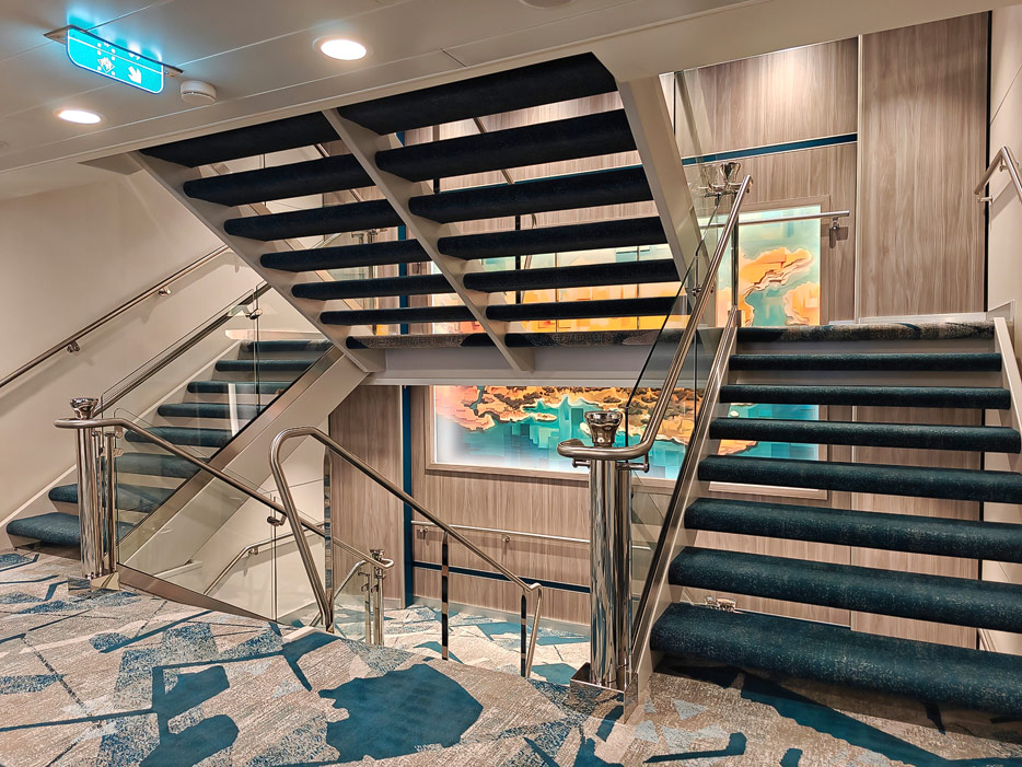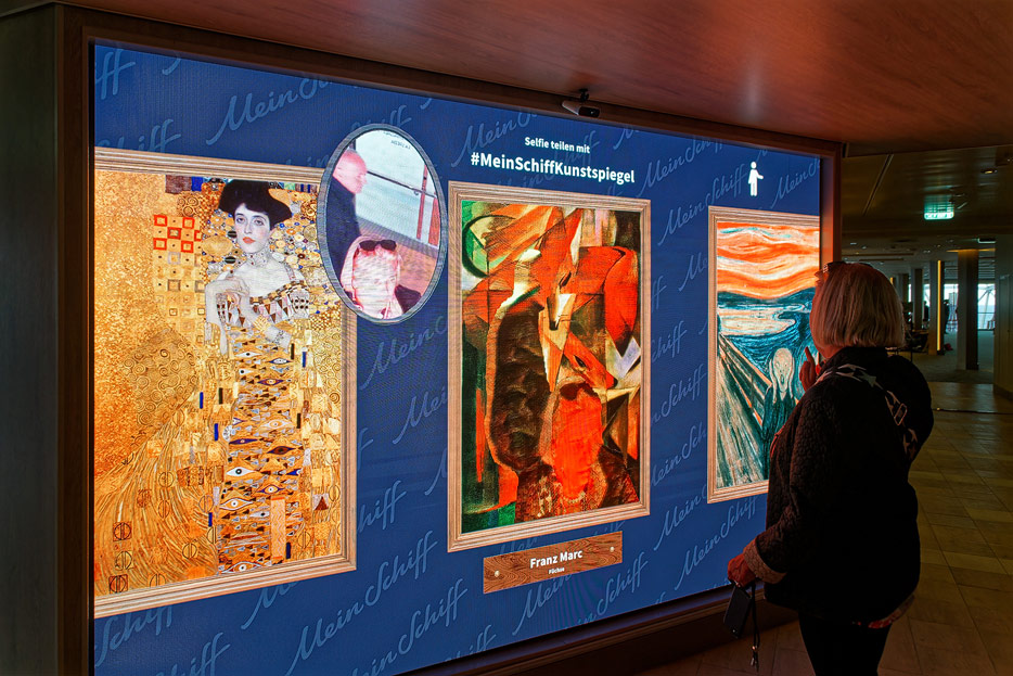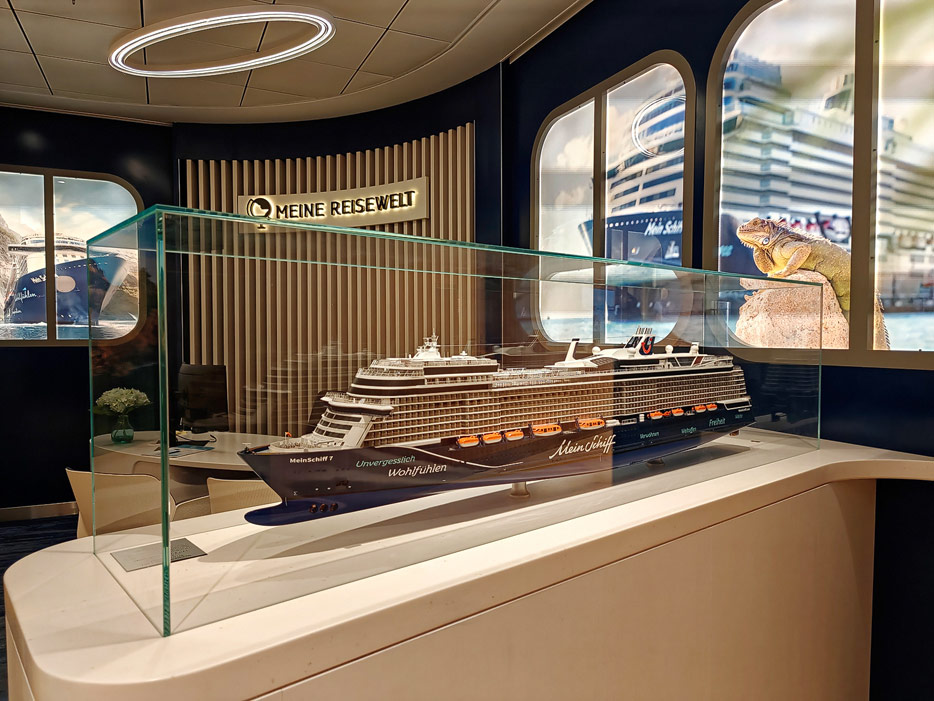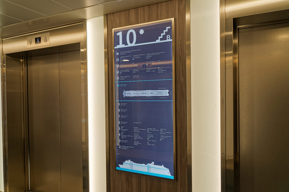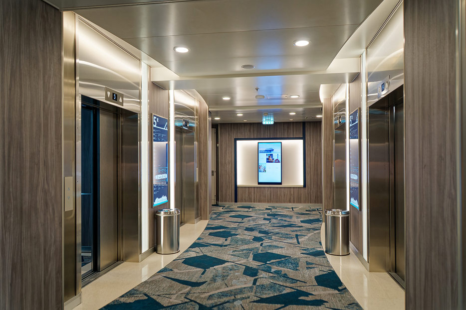 Bilder weiterer Bereiche der Mein Schiff 7, u.a. Atrium, Rezeption, Leselounge, Treppenhaus und Aufzüge