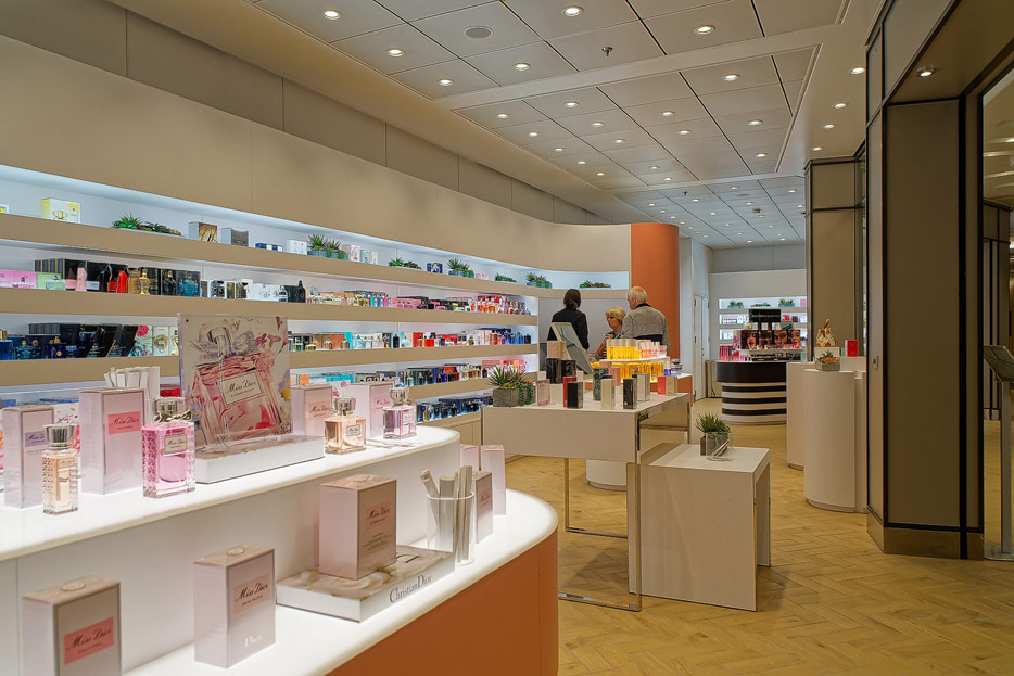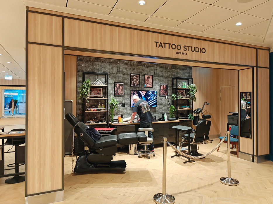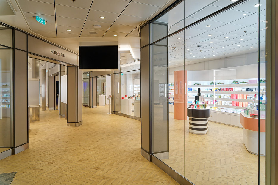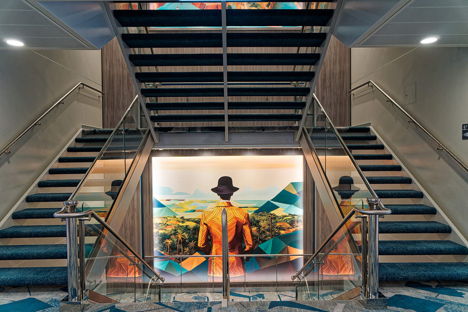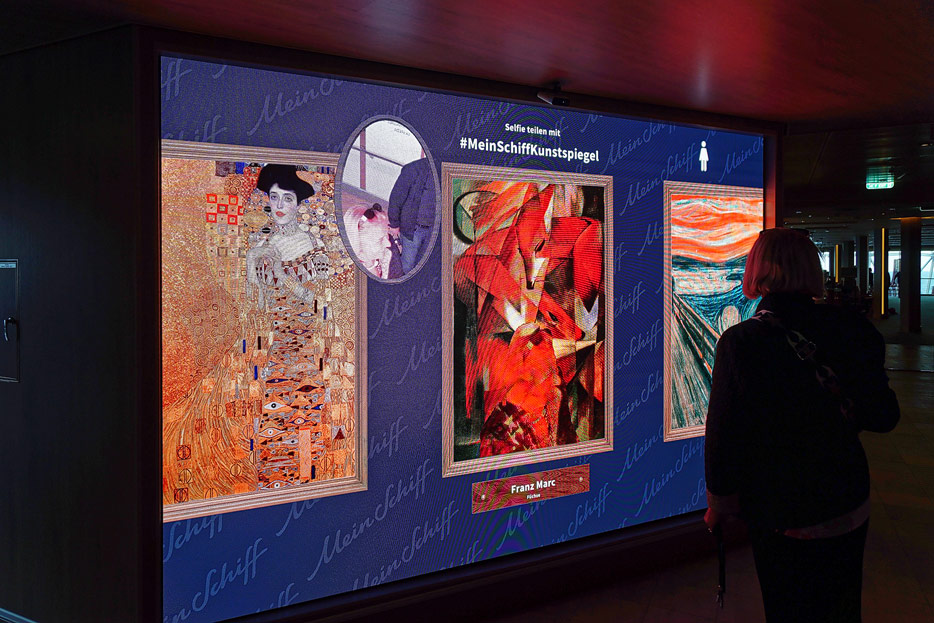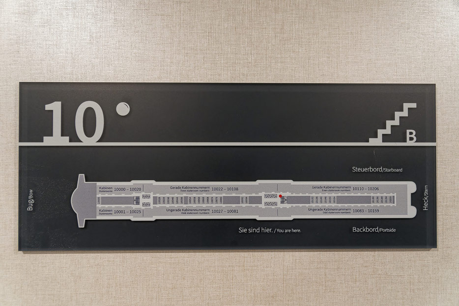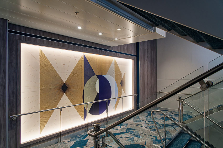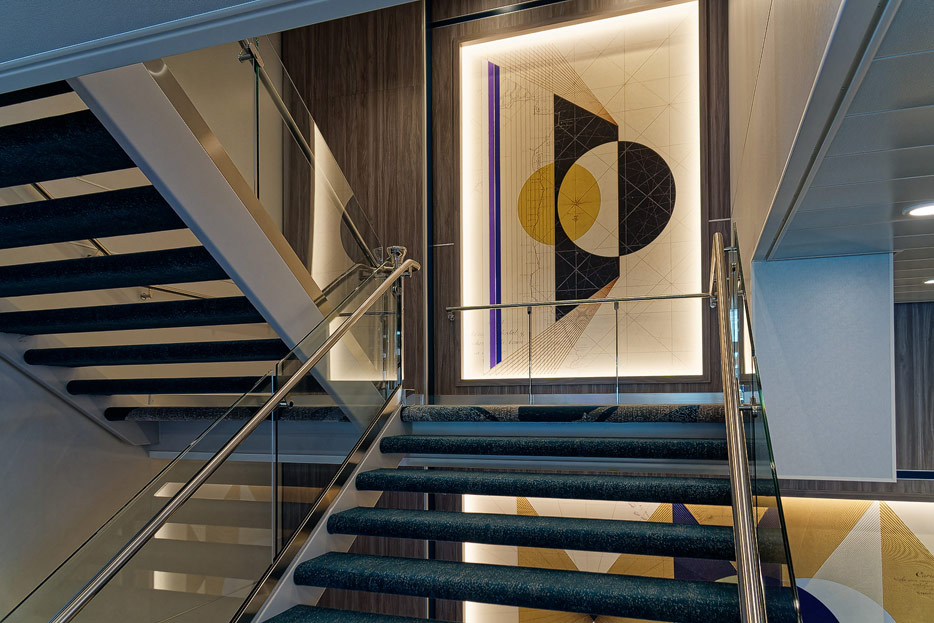 Bilder weiterer Bereiche der Mein Schiff 7, u.a. Atrium, Rezeption, Leselounge, Treppenhaus und Aufzüge