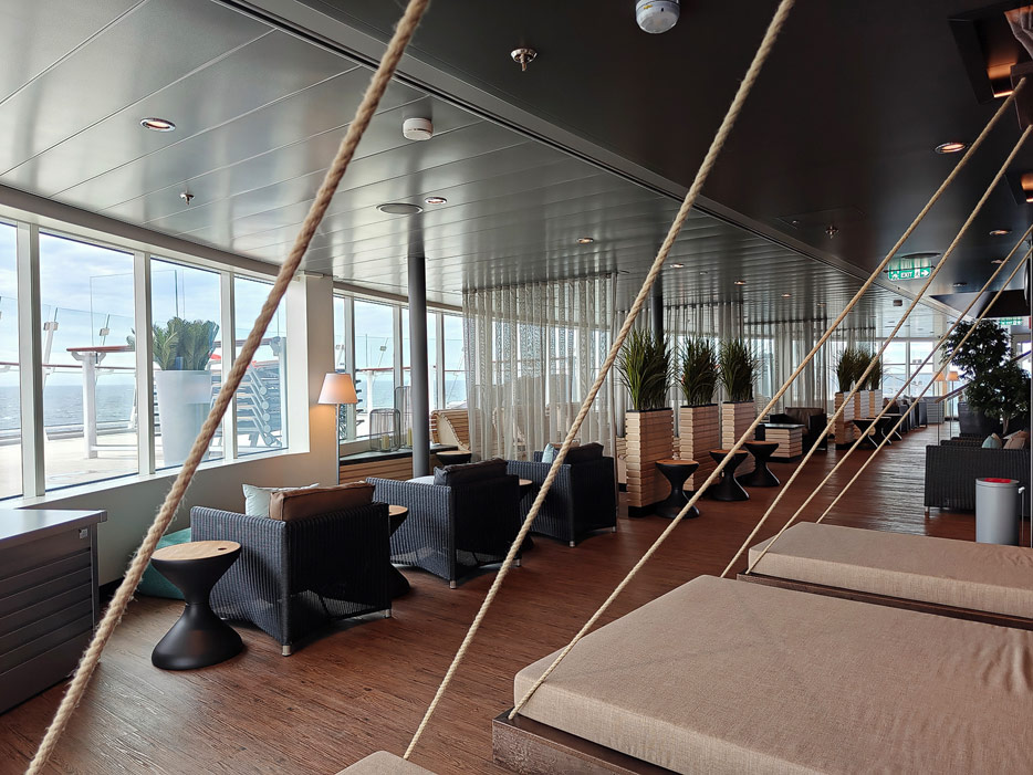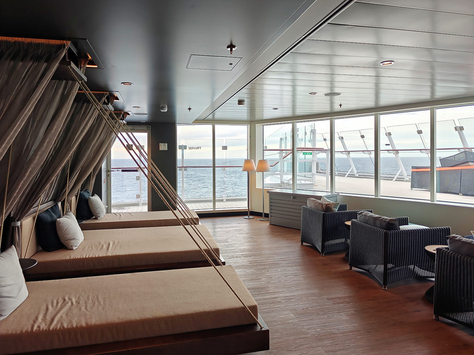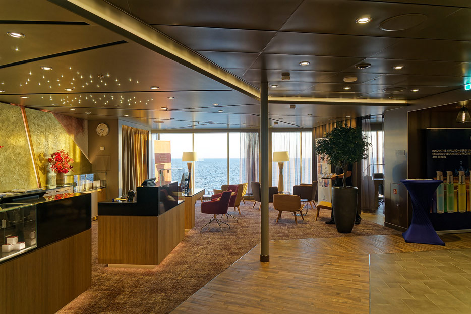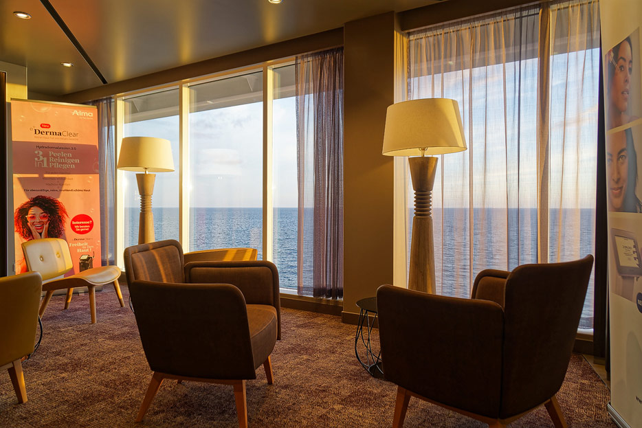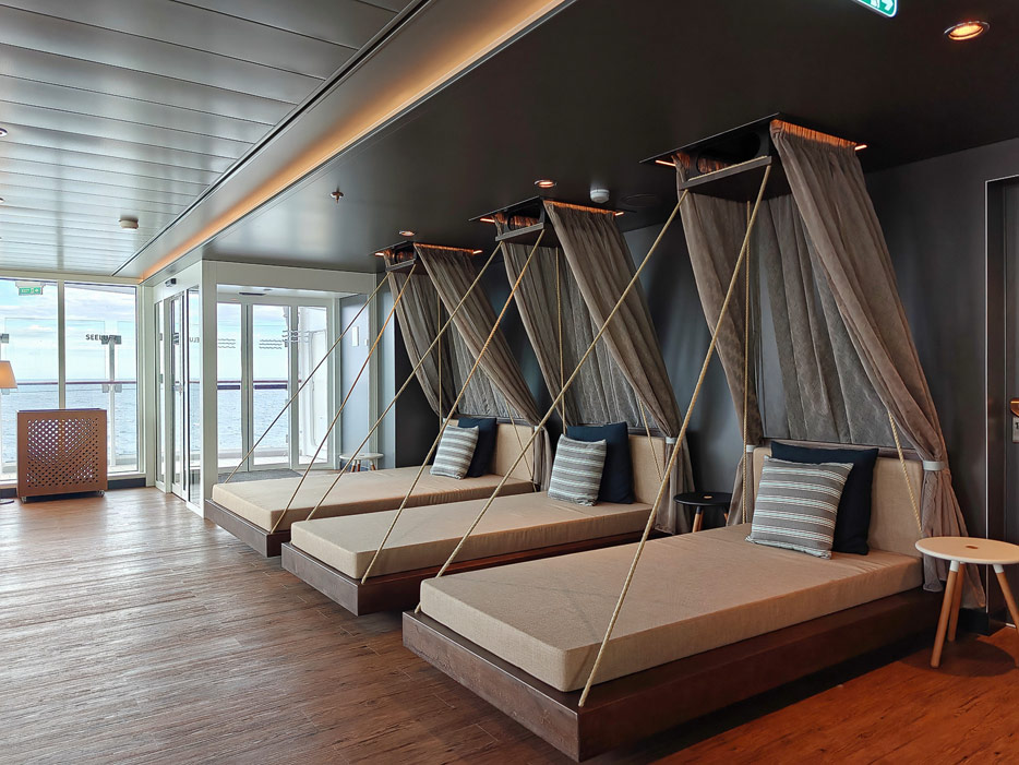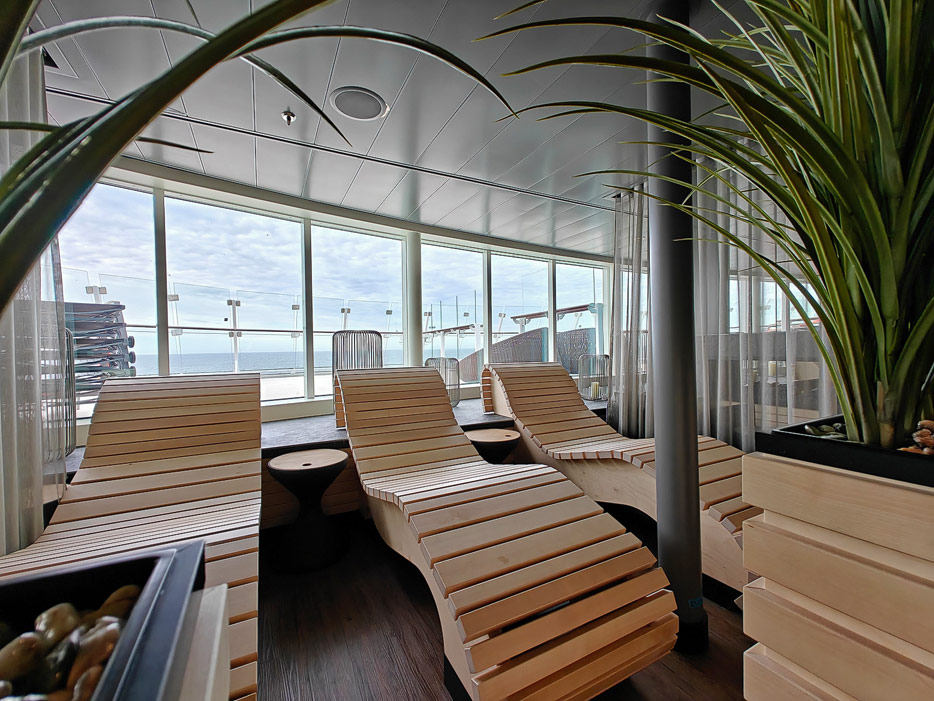 BiIlder des Spa, der Sauna-Landschaft, des Fitness-Studios, Arena-Sporthalle und Joggingbahn der Mein Schiff 7