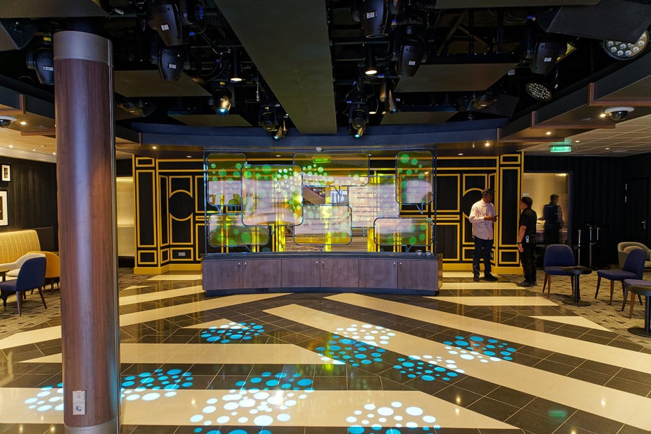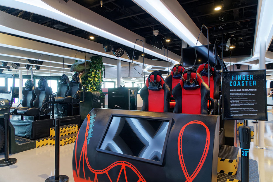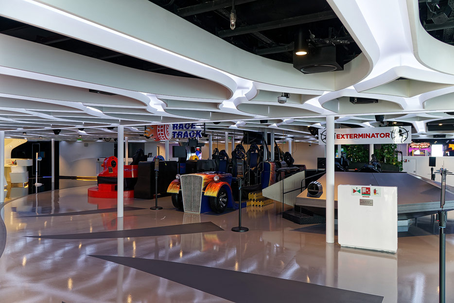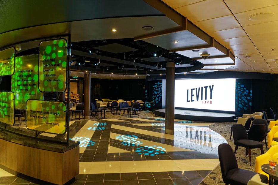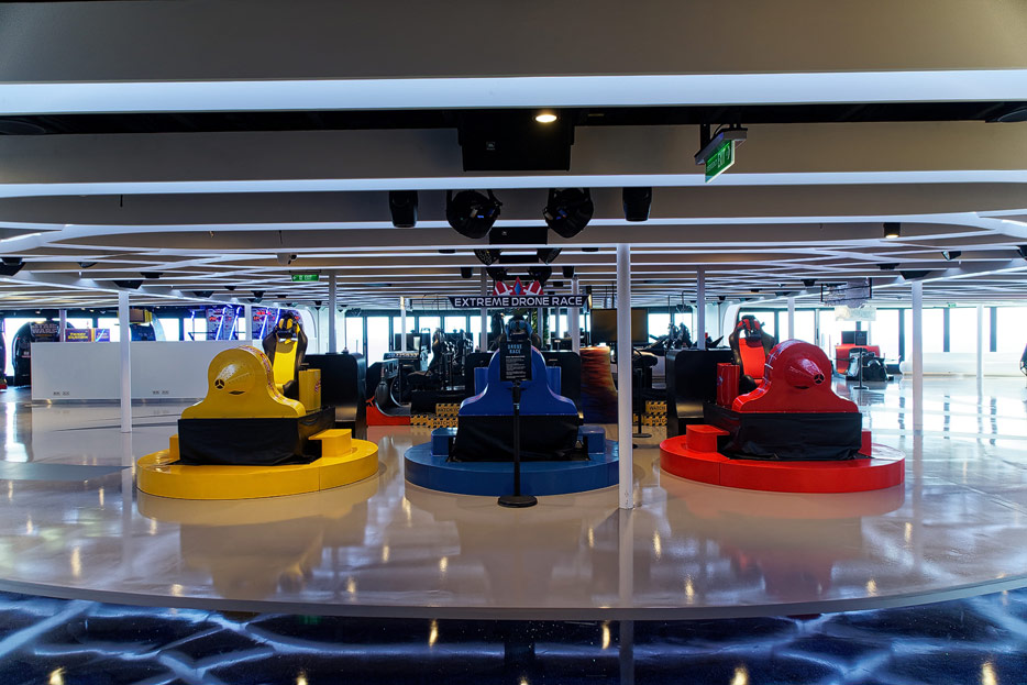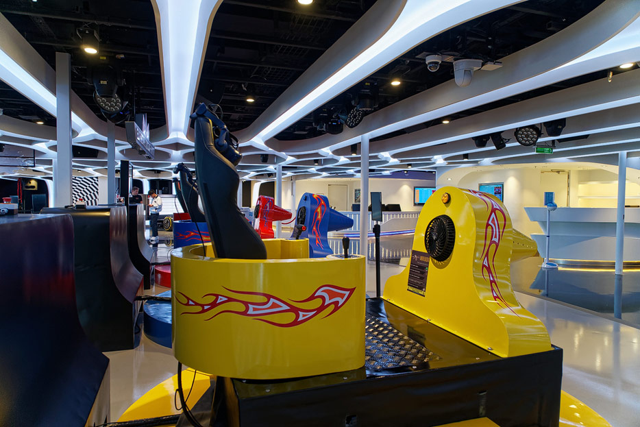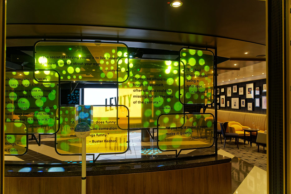 Bilder der Entertainment-Angebote der Norwegian Joy: Theater, Lasertag-Anlage, Comedy Club, Galaxy Pavilion