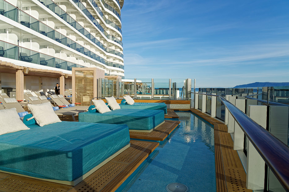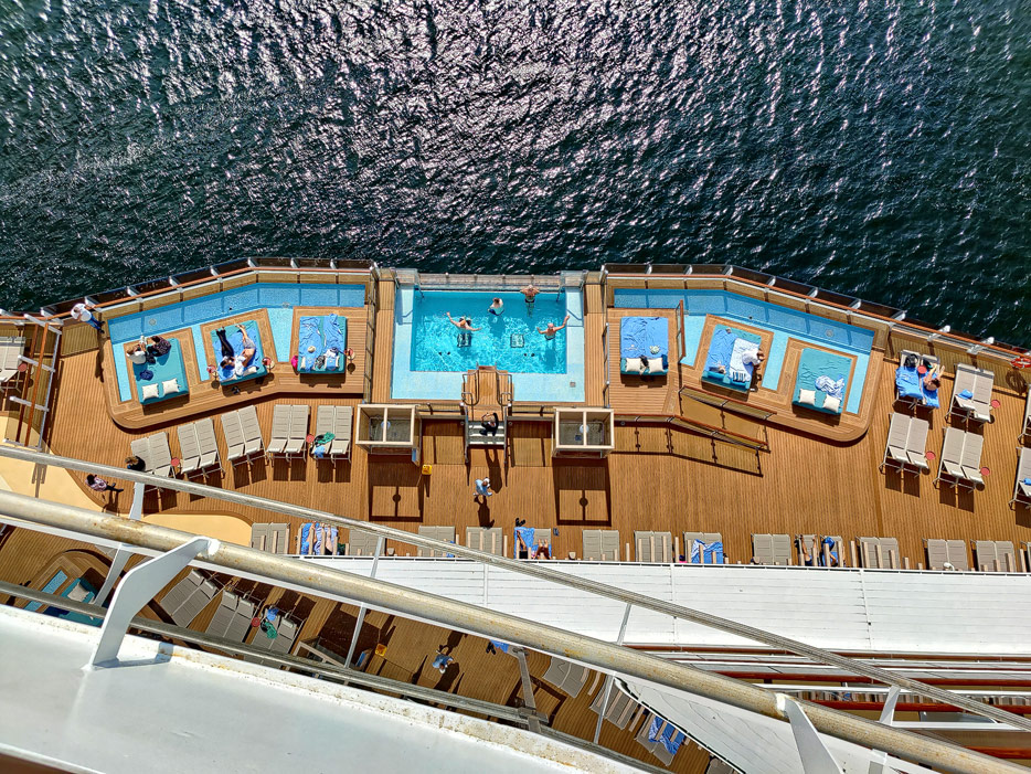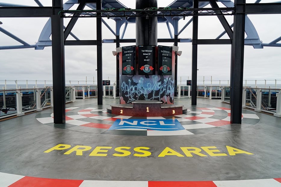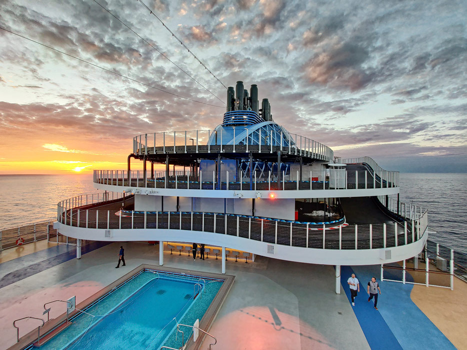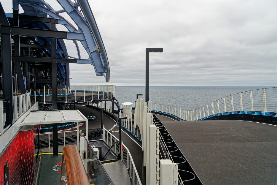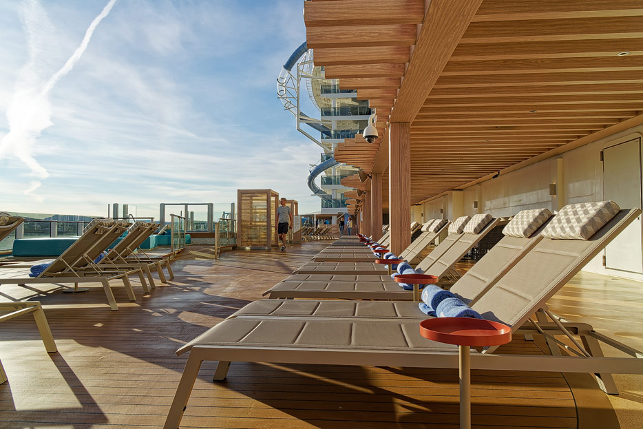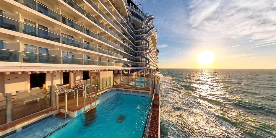 Bilder der Außenbereiche der Norwegian Prima: Pools, Infinity Beach, Sonnendeck, Promenade, Ocean Walk, The Concourse, Kart-Rennbahn, Trockenrutschen, Wasserrutsche Wave