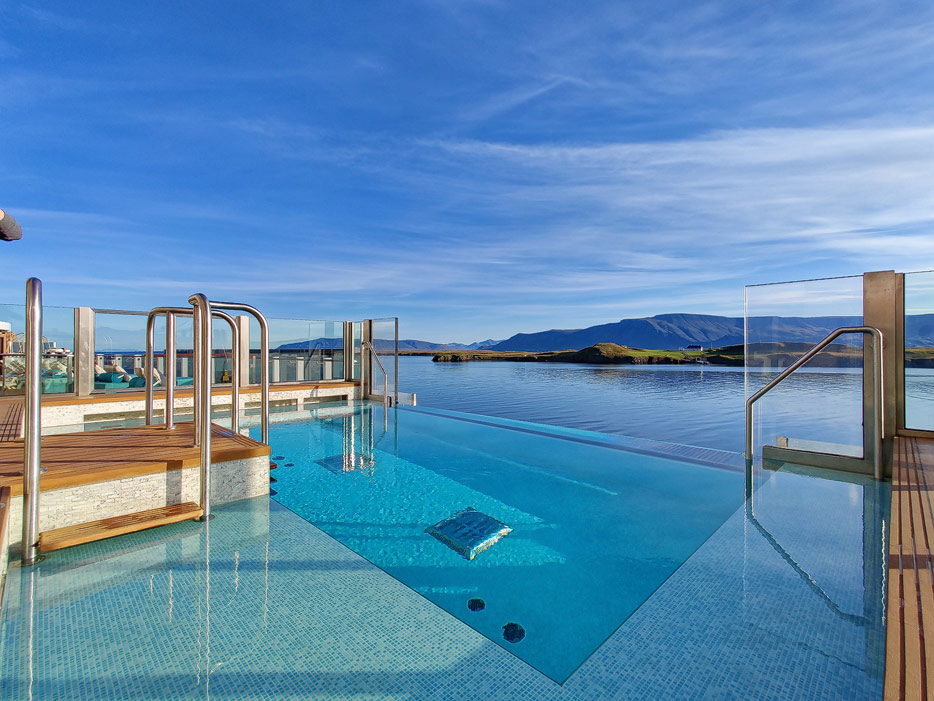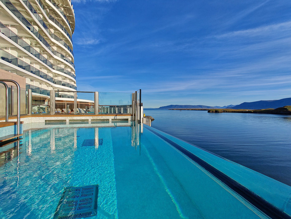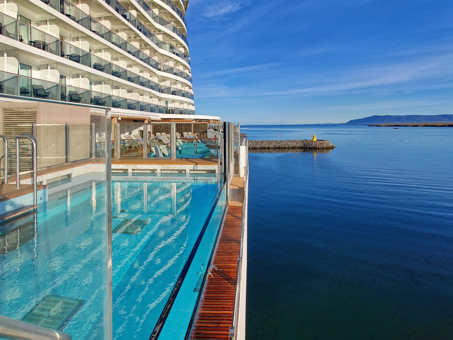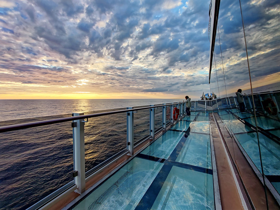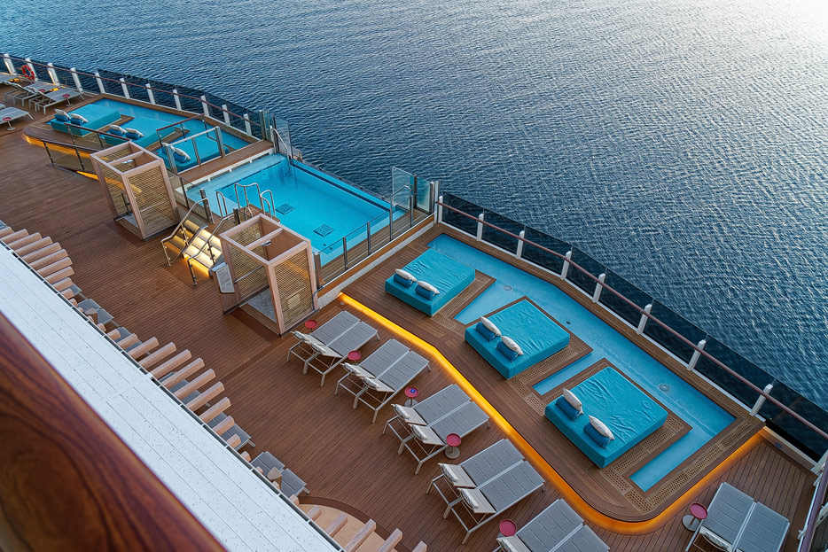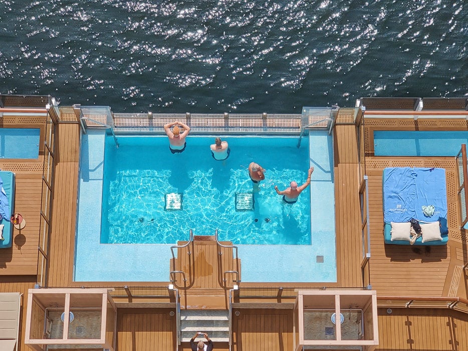 Bilder der Außenbereiche der Norwegian Prima: Pools, Infinity Beach, Sonnendeck, Promenade, Ocean Walk, The Concourse, Kart-Rennbahn, Trockenrutschen, Wasserrutsche Wave