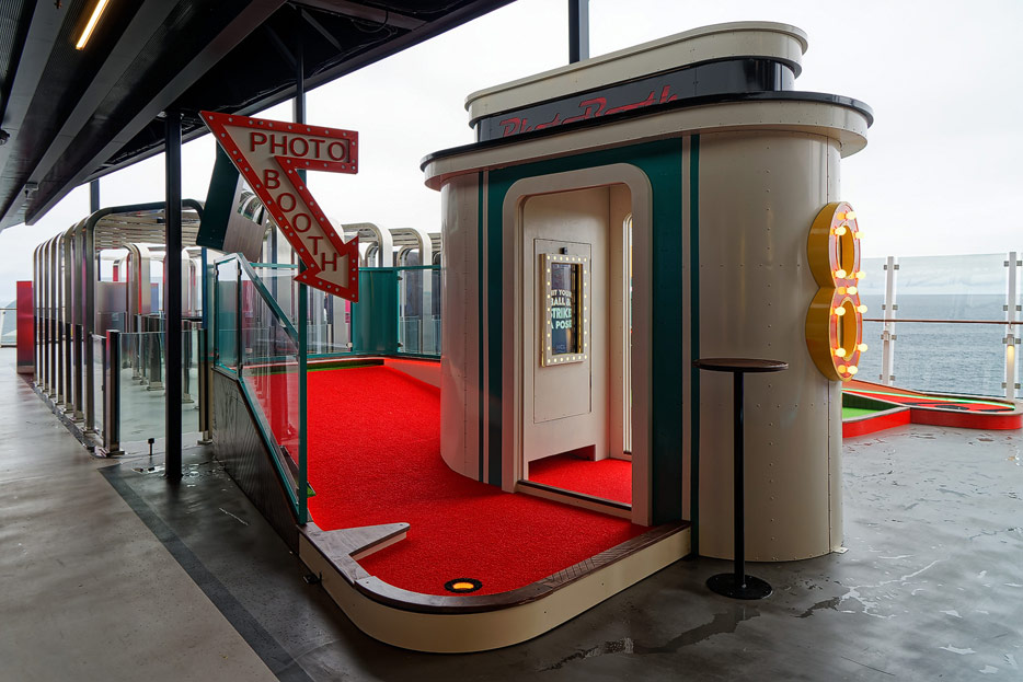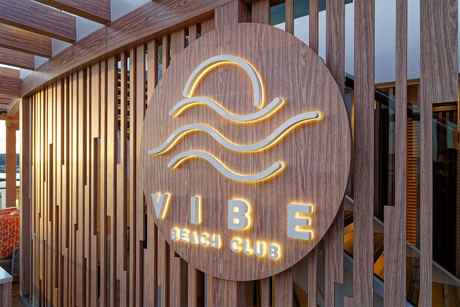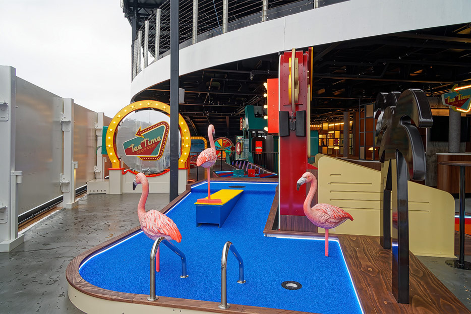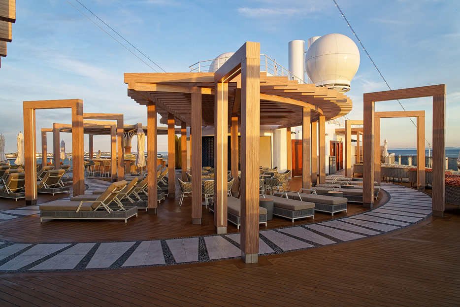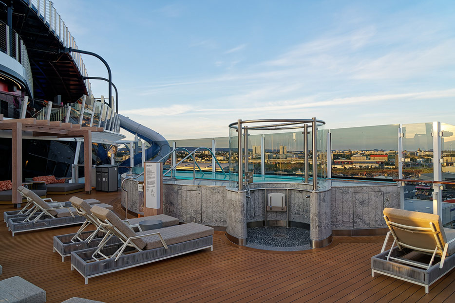 Bilder der Außenbereiche der Norwegian Prima: Pools, Infinity Beach, Sonnendeck, Promenade, Ocean Walk, The Concourse, Kart-Rennbahn, Trockenrutschen, Wasserrutsche Wave