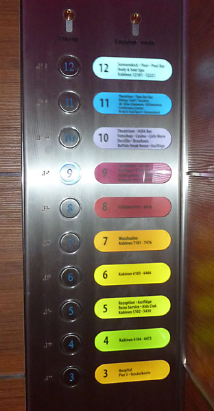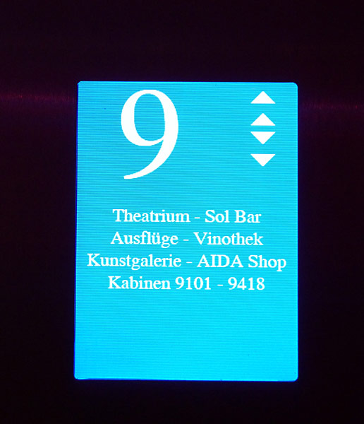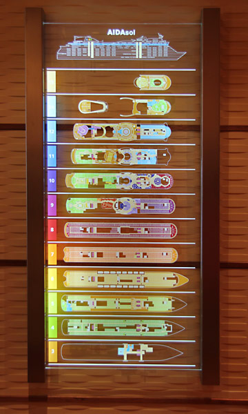 Orientierungshilfen, Aufzüge, Treppenhäuser, Wegweiser auf der AIDAsol