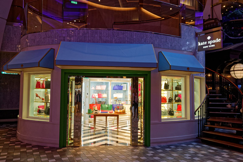 Royal Promenade der Allure of the Seas: Rising Tide Bar, Rezeption, Shops, Promenade Cafe, Bow & Stern Pub, Boleros, Cupcake Cupboard, Starbucks Cafe, Sports Bar, Clock Tower, Paraden-Shows
