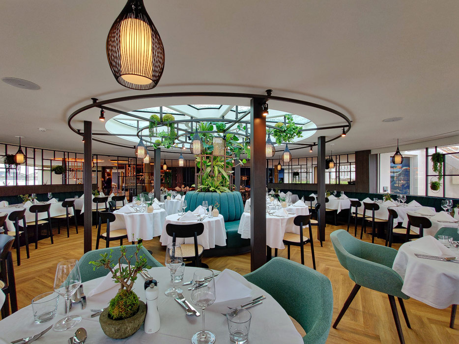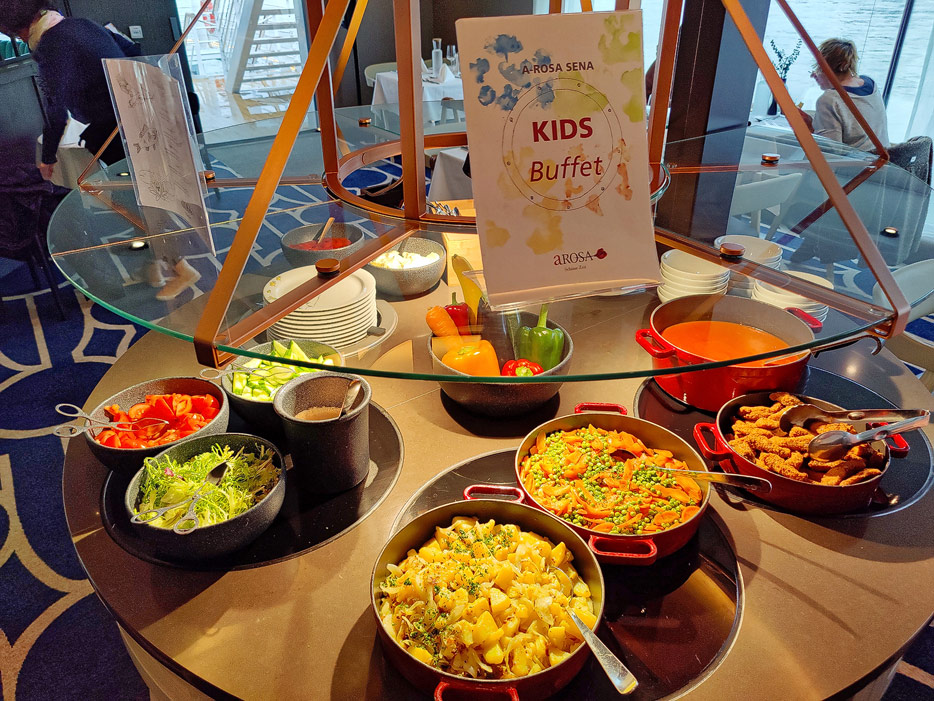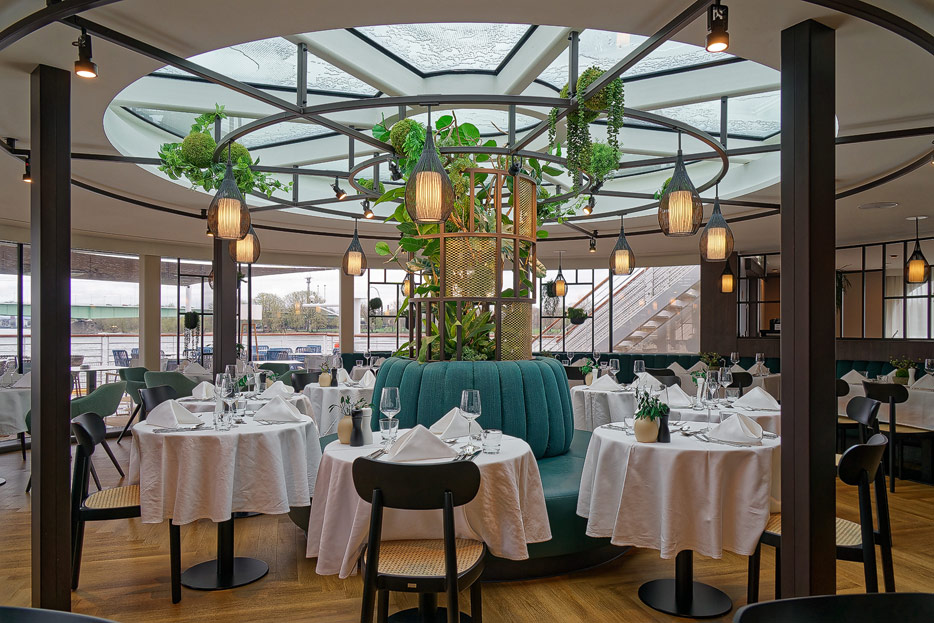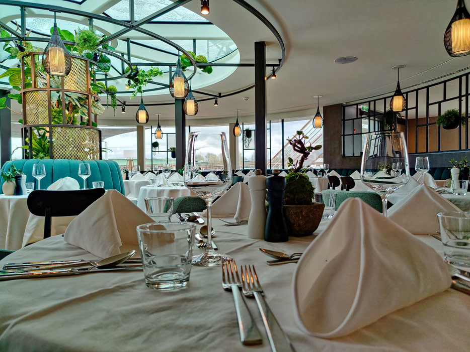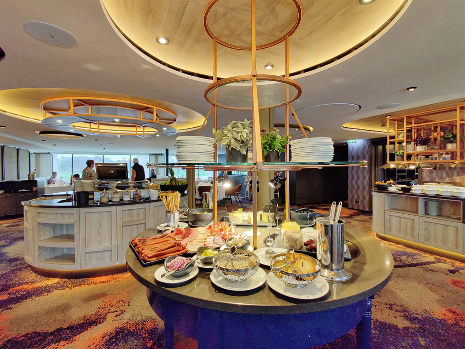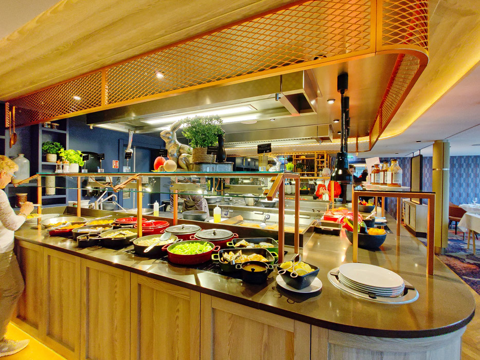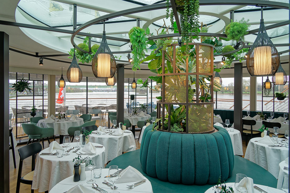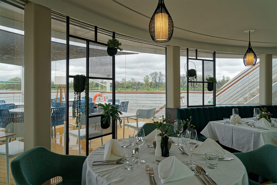 Bilder der Restaurants auf der A-Rosa Sena: Market Buffet-Restaurant mit Pavilion und River-Side sowie des Spezialitätenrestaurants Sena Grill