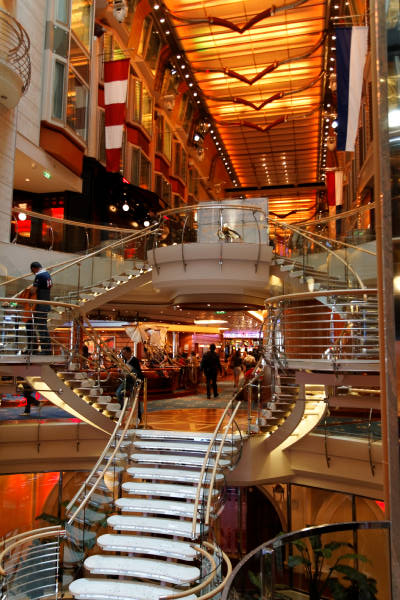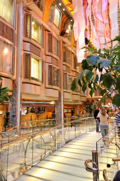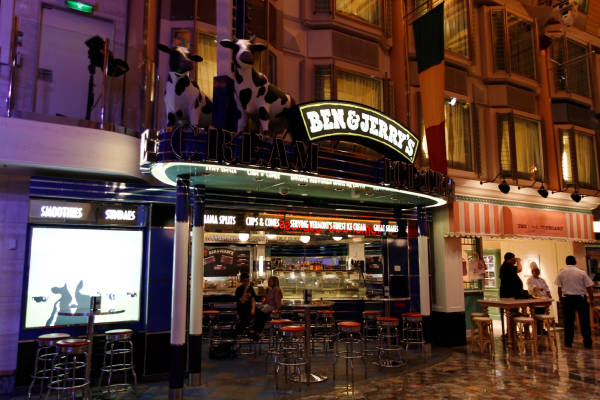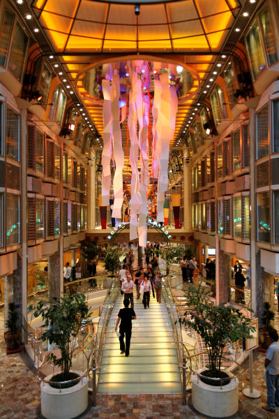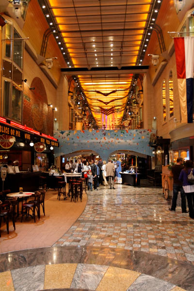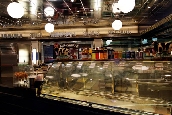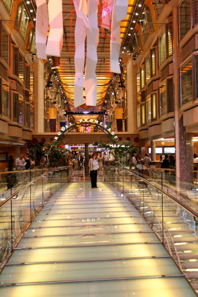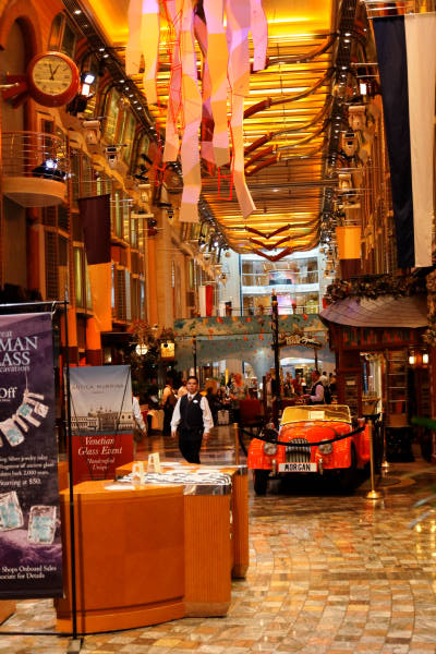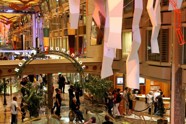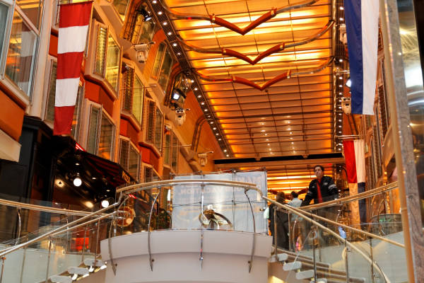 Royal Promenade der Liberty of the Seas inklusive Cupcake Cupboard, Sorrento’s Pizzeria, Hoof and Claw Pub, Ben & Jerry’s Eiscafe, Promenade Cafe, Champagne Bar und Vintages Weinbar