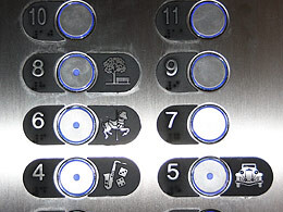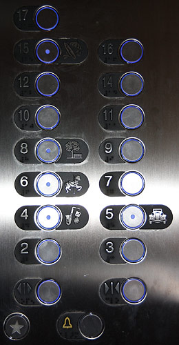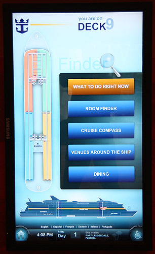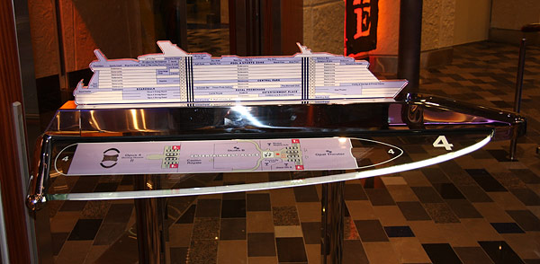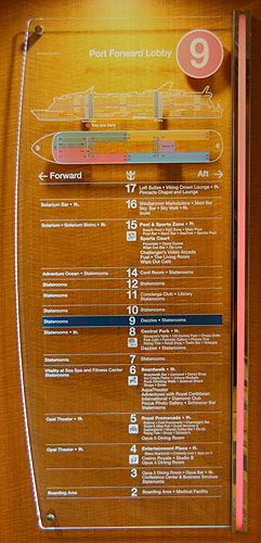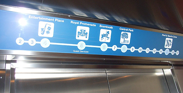 Piktogramme an den Aufzug-KnöpfenPiktogramme bei der Deck-Anzeige in den AufzügenTafeln mit Decksplänen an den AufzügengGläserne Schiffs-Schnitte und DeckspläneGläserne Schiffs-Schnitte und DeckspläneGläserne Schiffs-Schnitte und DeckspläneKleine Pfeile zeigen an, wo vorne istInteraktive TouchscreensWegweiser und Strassenschilder