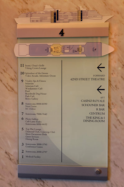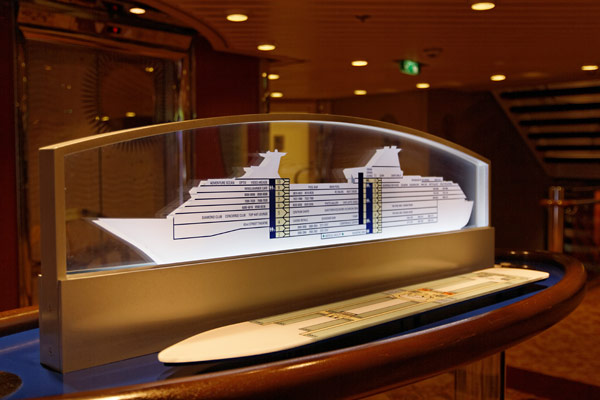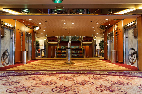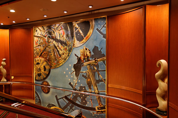 Sonstige Bereiche der Splendour of the Seas – Treppenhaus, Teenlounge Optix, Rmero Britto Gallery, Shops, Casino, Aussenbereiche: Kletterwand, Minigolf, Tischtennis
