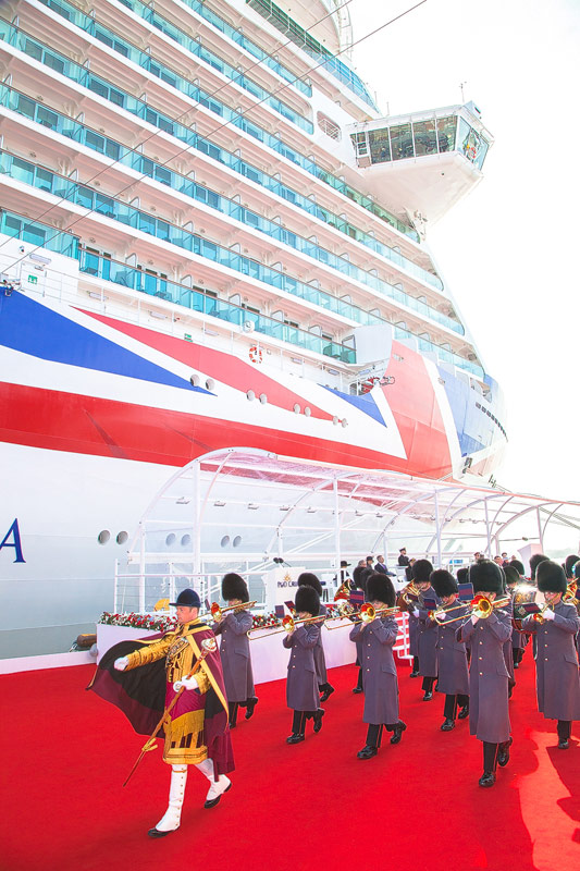 Die Britannia ist aber nicht nur das größte Kreuzfahrtschiff am britischen Markt, sondern auch in ihrem Ambiente wohl das britischste. Ein riesiger Union Jack ziert das Schiff. Die Flagge ist mit 280 Litern roter, 40 Litern dunkelroter, 80 Litern blauer und 20 Litern dunkelblauer Farbe auf den Bug gemalt. Anders als die übrigen Kreuzfahrtschiffe on P&O Cruises fährt die Britannia nicht unter der Flagge der Bermudas – die der britischen Flagge relativ ähnlich sieht – sondern tatsächlich unter britischer Flagge mit Heimathafen Southampton. Und selbst die Sektflasche bei der Taufe soll aus einer britischen Sektkellerei stammen.