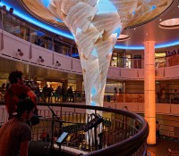 Ein Gag, aber auch eine optisch beeindruckende Bar ist die Vista Lobby, dem drei Decks hohen Atrium der Carnival Vista. In der Mitte der kreisrunden Bar steht eine riesige LED-Video-Säule, die nach oben hin breiter wird und in ihrer Form einem Trichter oder einem Martiniglas ähnelt. Nach Tageszeit wechselnd wirkt diese LED-Installation mal wie ein überdimensionierter Cocktail inklusive roter Kirsche, mal wie ein Meeresaquarium, in dem filigrane Quallen durchs Wasser gleiten und Fischschwärme vorüber ziehen.