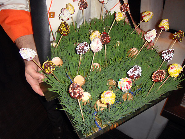 Ein Menüpunkt kommt beispielsweise in einer Art Setzkasten mit insgesamt 12 verschiedenen Gerichten. Alle Gerichte fantasievoll präsentiert und erfreulicherweise keine abgedrehten, abenteuerlichen geschmacklichen Überraschungen nur um des Effekts willen: Mini-Hamburger aus Kobe-Beef zum selbst zusammenstellen, Sushi-Lollipops am Stiel, Disco-Shrimp auf blau blinkenden Eiswürfeln. Das meiste leicht asiatisch angehaucht und durchweg lecker. Das optische Highlight kam zum Schluss: Mit Schokolade überzogene Früchte und Creme Brulee in angesägten Eierschalen, präsentiert wie ein Osternest. Ich muss wohl nicht erwähnen, dass die Creme Brulee reichlich lecker schmeckt.