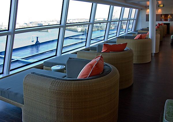 Ich bin sonst kein Fan von Spa und Wellness auf Kreuzfahrten (auch wenn mir Maurice auf der Eclipse das sehr liebenswert versucht hat, schmackhaft zu machen), aber das AquaSpa der Celebrity Eclipse muss ich doch erwähnen. Auch hier viel Licht, der enorme Fitnessbereich mit Laufbändern, Fahrrädern et cetera mit großen Panoramafenstern – da macht Fitness wirklich Spaß, der Ausblick aufs Meer ist sensationell. Für Passagiere in den AquaClass-Kabinen gibt’s ein besonderes Schmankerl, die Relaxation Lounge: ein Raum mit Panoramafenstern nach vorne mit bequemen, breiten Liegen und vollkommener Ruhe. Einen besseren Platz, um entspannt aufs Meer zu schauen, kann ich mir nicht vorstellen. Allein diese Relaxation Lounge wäre für mich schon ein starkes Argument, den Mehrpreis für eine AquaClass-Kabine zu rechtfertigen.
