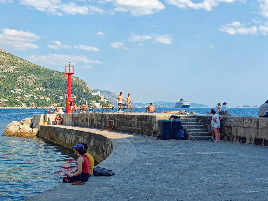 Durch einen kleinen Durchgang in der Stadtmauer schlüpfen wir stattdessen hinaus aus der Altstadt zur Buza Bar. Deren Terrassen hängen quasi außen unter der Stadtmauer an den Klippen. Wahrgenommen hatte ich diese Bar schon bei früheren Dubrovnik-Besuchen, bin aber nie hinuntergestiegen, weil ich dachte: Das kann eigentlich nur eine überteuerte Touristenfalle sein. Ein Fehler. Das Bier ist hier mit 7,50 Euro auch nicht teurer als in der Altstadt. Und wenn man will, kann man die Klippen hinabsteigen und sogar baden. Die Bar ist sehr entspannt und ein schöner Kontrast zur heißen, touristenüberlaufenen Altstadt.