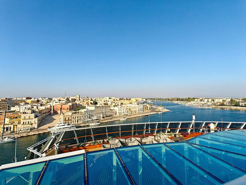 Auf den ersten Blick ist Brindisi kein sonderlich attraktiver Kreuzfahrt-Hafen. Aber in der Nähe liegen Alberobello und Lecce, beides schöne Ausflugsziele. Spektakulär jedenfalls ist die Hafeneinfahrt nach Brindisi zum MSC-Terminal di Levante. Die Einfahrt ist eng und der Platz zum Drehen vor dem Anleger ist knapp. Frühes Aufstehen lohnt sich für diese Einfahrt.