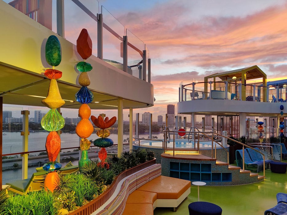 Geringfügig ruhiger und abgeschiedener gibt es zwei Decks höher auf der Steuerbordseite das Cloud-17-Sonnendeck, ebenfalls mit einem Infinity-Pool – direkt an der Lime & Coconut Bar. Ursprünglich sollte dieser Bereich exklusiv für Erwachsene reserviert sein. Die Reederei hat sich das kurz vor Indienststellung aber noch einmal anders überlegt und stattdessen „The Hideaway“ am Heck des Schiffs zum Adults-only-Pool- und Sonnendeck zu erklären.