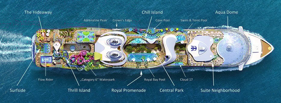Außerdem sollten es mehr Pools werden als auf den Oasis-Class-Schiffen. Sieben Pools mit 62 Prozent mehr Wasserfläche sind aus diesem Konzept letztlich hervorgegangen. Vier der Pools sind Infinity-Pools mit direktem Meerblick, zwei seitlich und zwei am Heck.