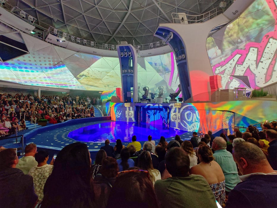 Im Mittelpunkt des Aquadome steht eine Weiterentwicklung des Aqua Theaters. Das auf den Oasis-Class-Schiffen unten auf den Decks 5 und 6 am Heck unter freiem Himmel angesiedelt ist. Auf der Icon of the Seas hat Royal Caribbean das Aqua Theater nun ganz nach vorne und oben auf Deck 15 geholt, was schon statisch für den Schiffbau eine große Herausforderung war.
