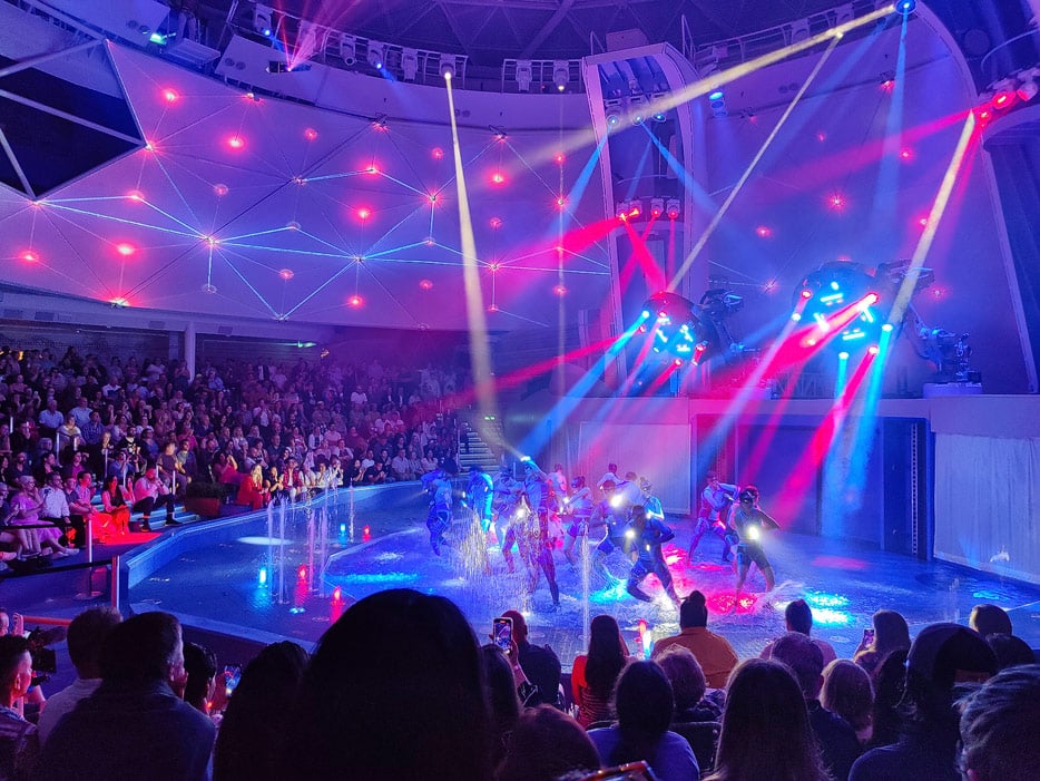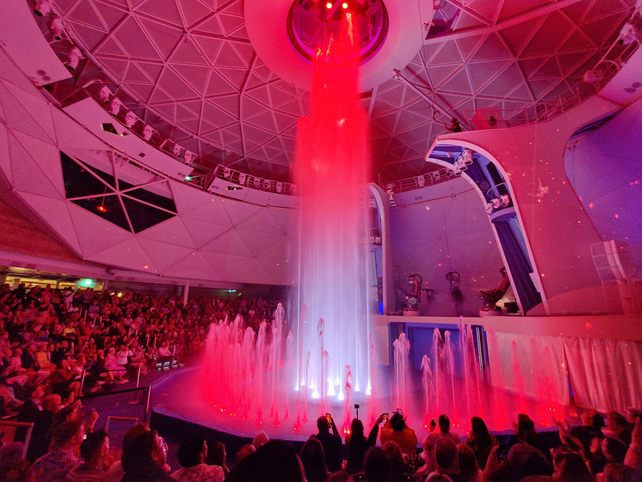 Tagsüber bietet der Glasdome einen beeindruckenden Blick nach draußen, mit dem sich bestenfalls „The Dome“ der demnächst in Dienst gehenden Sky Princess messen kann, wenn auch dort deutlich kleiner. Abends lässt sich der Bereich des Aquatheaters beweglichen, dreieckigen Panel-Konstruktionen zu einer geschlossen Kuppel verwandeln, sodass eine riesige Video-Projektionsfläche für die Shows entsteht. Zugleich bleibt die Glasfront nach vorne aber bestehen – die Abendstimmung in diesem riesigen Raum ist großartig.