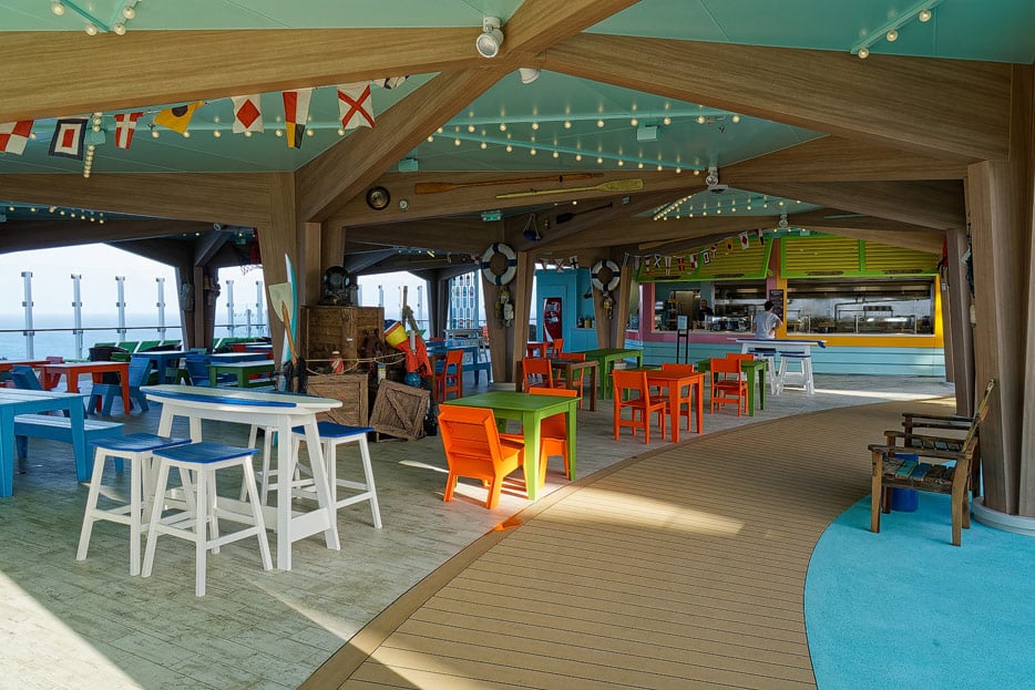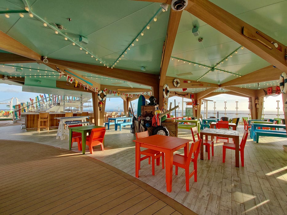 Dadurch verschiebt sich das Karussell optisch in die Mitte des Bereichs, der gefolgt von einigen Spielgeräten im Trockenen, einer Videospiele-Arcade und den Restaurants zum Heck hin in den Wasserspielplatz Splashaway Bay und den Infinity-Pool Water’s Edge übergeht. Ebenfalls in diesen Pool integriert ist die „Baby Bay“ als ein für Kleinstkinder sicheren Teilbereich mit sehr seichtem Wasser.