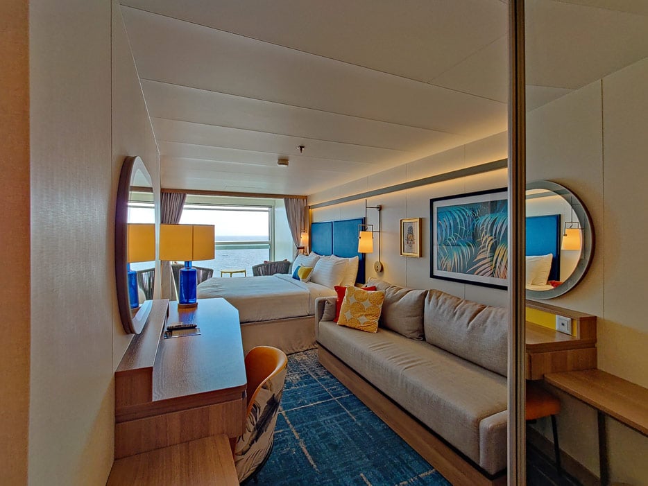 Die auf den Central Park gerichteten Kabinen haben keinen klassischen Balkon mehr, sondern sind „Infinity Balcony“-Kabinen. Das sind Kabinen mit einem bodentiefen Fenster, das sich aber zur Hälfte herunterfahren lässt, sodass der Bereich dahinter zum Balkon wird, in geschlossenem Zustand dagegen Teil des Wohnraums ist. Optisch aufgehübscht hat Royal Caribbean diese Fensterfront auf beiden Seiten mit bunten Fensterläden.