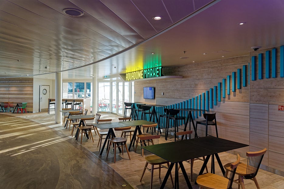 Ein für Royal Caribbean neues Konzept ist die Food Hall namens „Aquadome Market“. Die Auswahl umfasst hier fünf Angebote: GNGR (spricht sich „Ginger“, asiatisch), Mac’s (Macaroni and Cheese), Crème de la Crèpes (Crèpes), Toast & Garden (Sandwiches und Salate) sowie Feta Mediterranean (mediterrane Bowls). Das Food-Hall-Konzept ist in der Kreuzfahrt relativ neu.