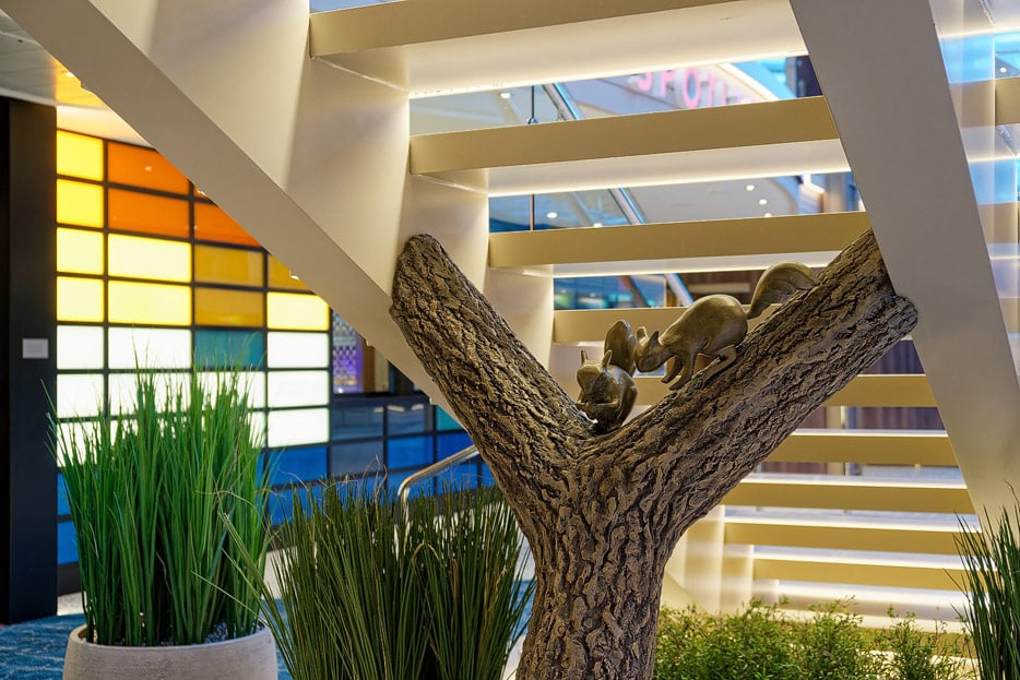 Und auch weitere Skulpturen und kleine Figuren hat die Reederei am Schiff versteckt. Manche bemerkt man erst auf den zweiten oder dritten Blick – wie etwa zwei EIchhörnchen, die auf einer Astgabel unter einer Treppe an der Royal Promenade sitzen. Diese Liebe zu Details findet man auf der Icon of the Seas wieder stärker als zuletzt auf den neuesten Oasis-Class-Schiffe.