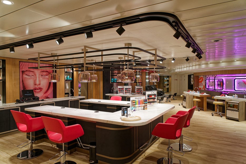 Eine Neuerung ist der „To Dry For“-Salon – die Royal-Caribbean-Adaption einer Blow Dry Bar: Ein hipper Haarsalon, um die Haare nach einem Strandtag schnell in Ordnung bringen zu lassen, nebenbei bei einem Glas Champagner ein Schwätzchen zu halten. Hier gibt’s also weder Haarschnitt noch Färben, sondern lediglich Styling.