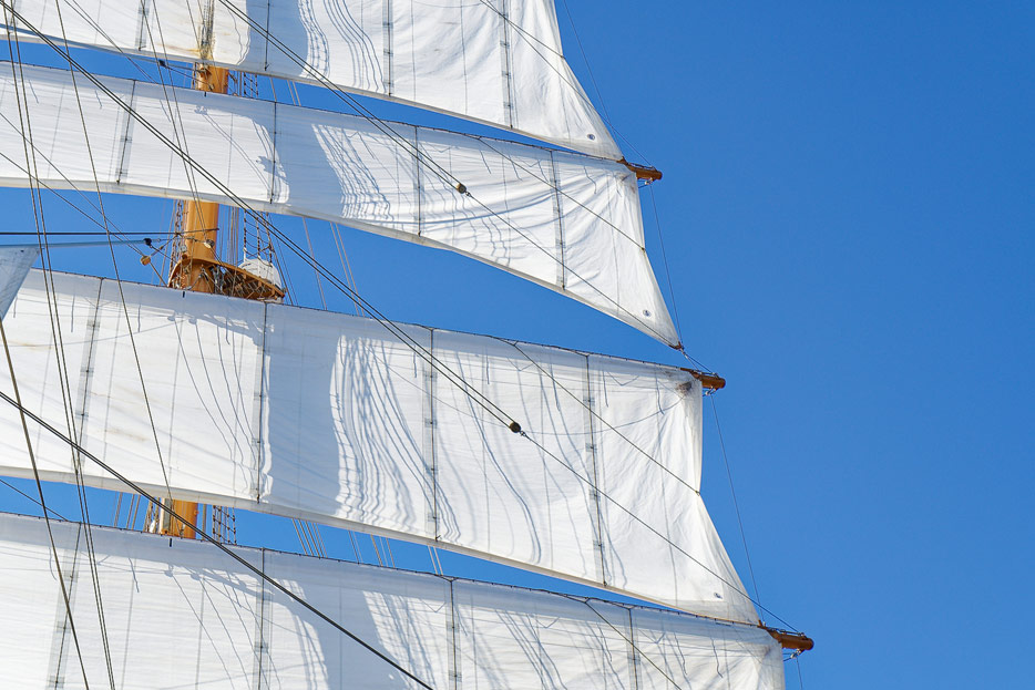 Auf einem Segelschiff wie der Sea Cloud Spirit das Highlight fast jeden Tages: das Segelsetzen. Die Matrosen (und Matrosinnen) klettern hoch hinauf in die Rahe, um die Segel loszumachen, bevor sie dann von unten mit Hilfe von Winden aufgezogen werden können. Abends klettern sie erneut nach oben, um die eingeholten Segel für die Nacht zu sichern.