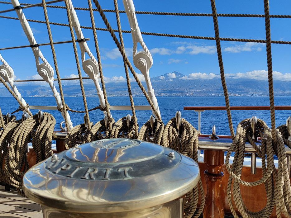 Von der Sea Cloud Spirit aus genießen wir den Blick auf den höchsten Berg Spaniens, den Vulkan Teide auf Teneriffa. Zum Sonnenaufgang ist er öfter einmal ohne Wolken, dass wir ihn fast den ganzen Tag ohne Wolken sehen können, ist etwas Besonders.