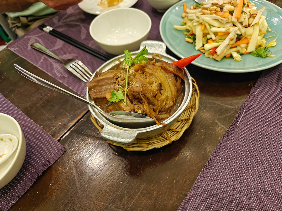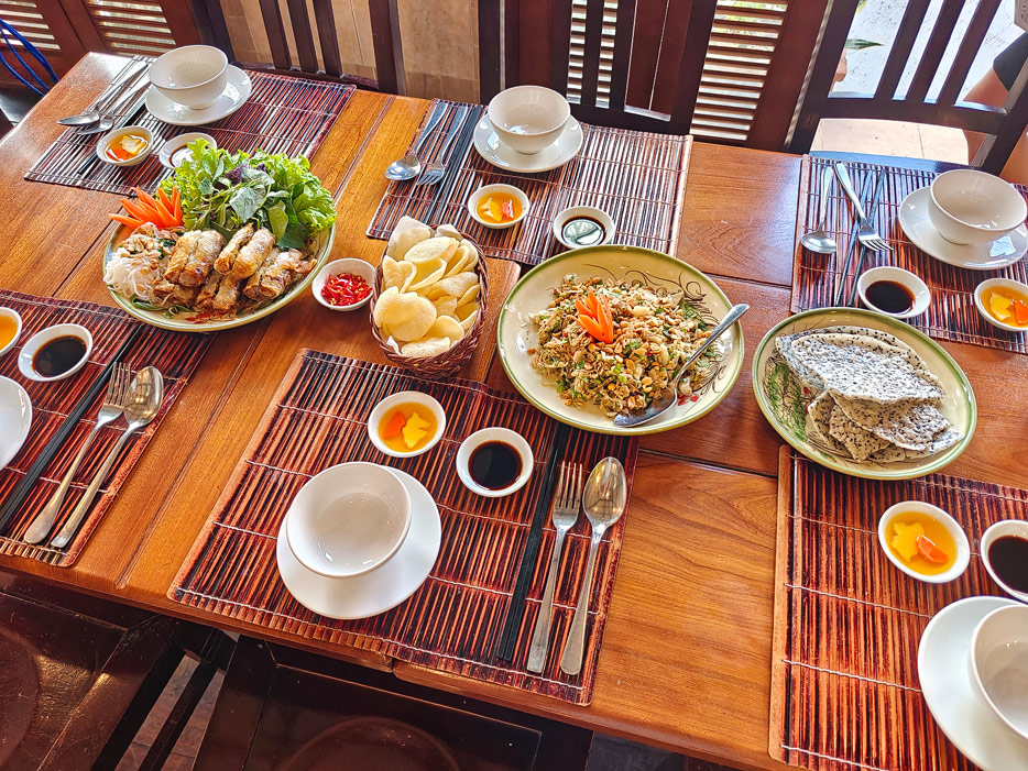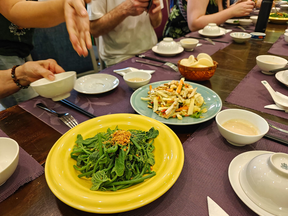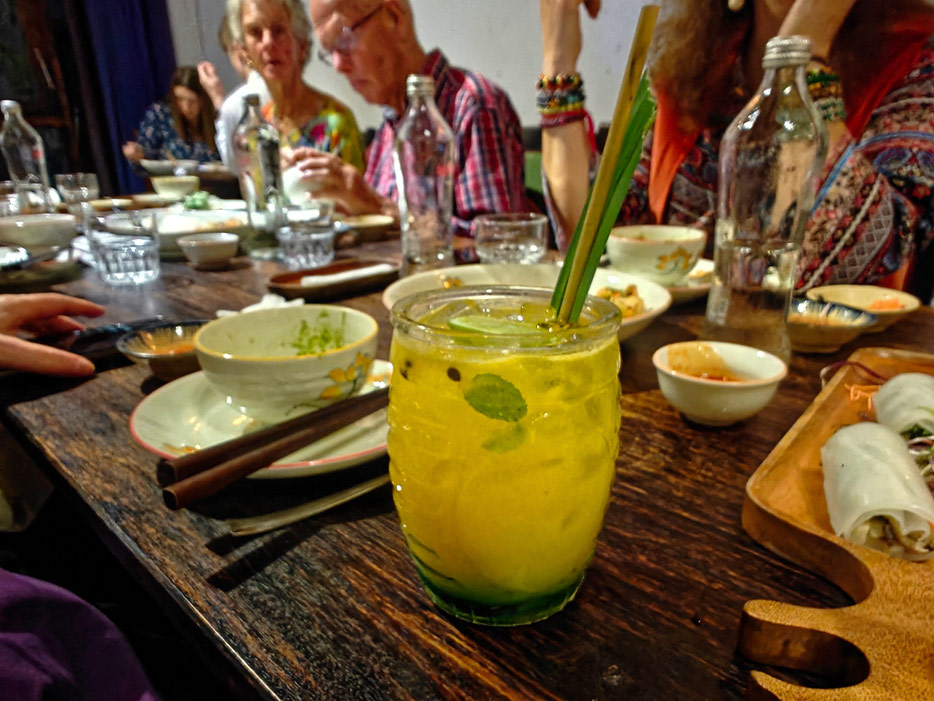 Zum Mittagessen gibt es das vietnamesische Nationalgericht: Pho-Suppe mit Rindfleisch, Reisnudeln, Kräutern und Bällchen aus Fisch und Krabbe. Dazu trinken wir frische Kokosnuss, die hier wie zuvor schon in Thailand unvergleichlich intensiver schmeckt als Trink-Kokosnuss in Deutschland. Das Dessert besteht aus dreierlei Bohnen mit einer süßlichen Kokosmilch.
