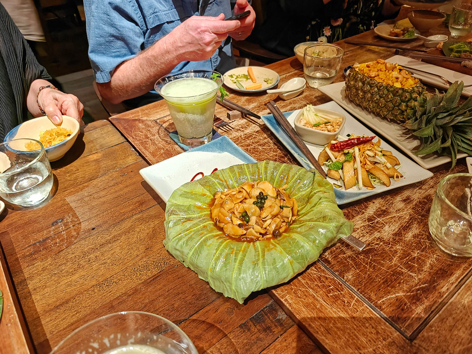 Ich trinke dazu einen grünen Smoothy aus Kokosnuss und Rau Ma (Englisch: Pennywort, Deutsch: Tigergras) – ziemlich lecker.