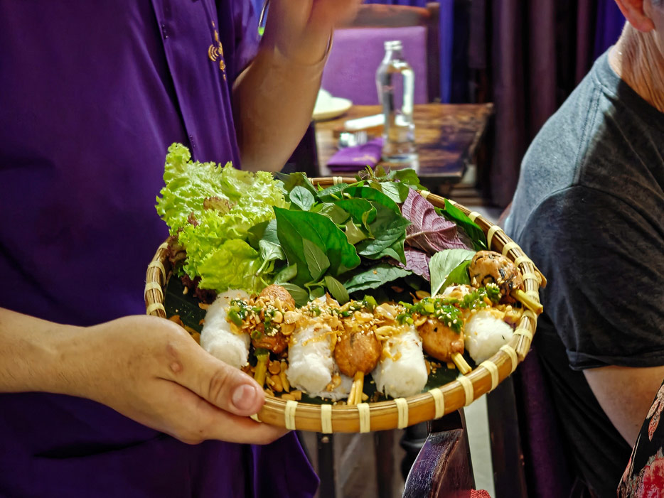 Nächster Stopp: ein Restaurant, spezialisiert auf vietnamesische Pfannkuchen. Die bestehen aus Reismehl und werden ganz dünne im Wok knusprig gebacken, belegt zum Beispiel mit Huhn oder Shrimps. Zum Essen reißt man Pfannkuchenstücke ab, wickelt sie zusammen mit Kräutern in ein Salatblatt und tunkt sie in mit Chili gewürzte Fischsauce.