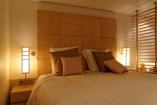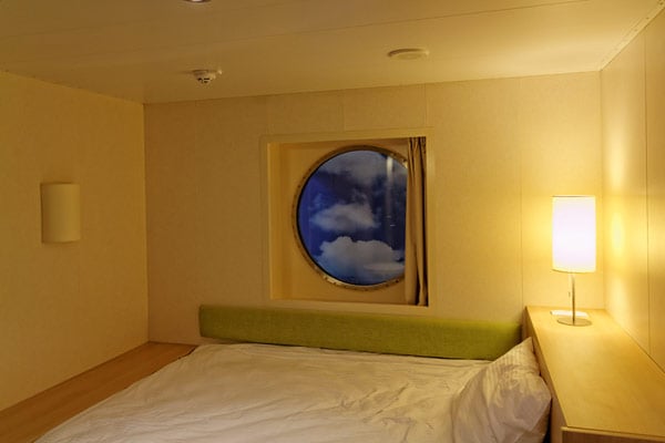 Die Helligkeit lässt sich über die voreingestellten Lichtstimmungen ganz nach dem eigenen Geschmack steuern. Was man aber nicht übersehen darf: Diese Mock-up-Kabinen sind ja nicht auf dem Schiff, sondern in der Kabinenfabrik – durchs Fenster fällt dadurch wesentlich weniger Licht als auf offener See oder im Hafen, weil das Ganze in einer Halle seht und nicht unter freiem Himmel …