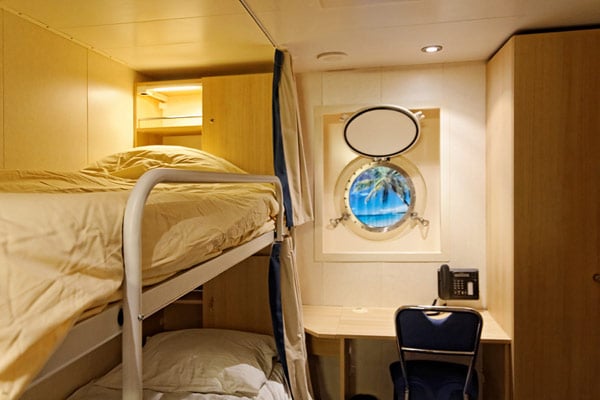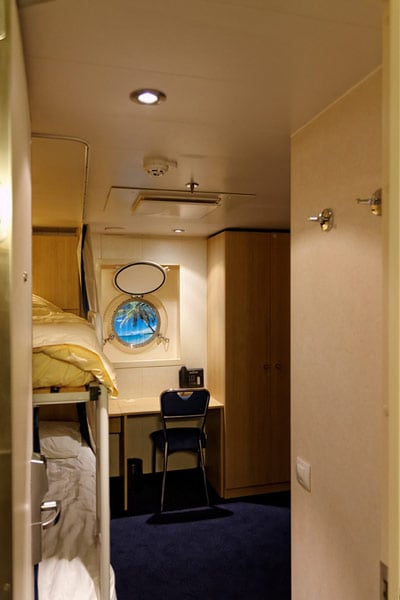 Nicht nur um ihre Passagiere muss sich eine Reederei bemühen – auch um gute Crew-Mitglieder zu bekommen, ist heutzutage Einiges an Aufwand nötig. Denn die Konkurrenz ist hart und vor allem die Nachfrage nach gut ausgebildeten Servicekräften und Offizieren ist groß. Crew-Kabinen haben auf der Europa 2 daher eine vergleichsweise großzügige Ausstattung und auch ein Bullauge für Tageslicht gehört dazu.