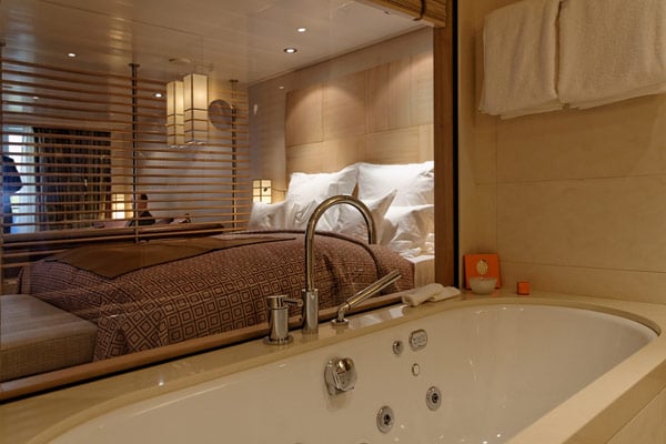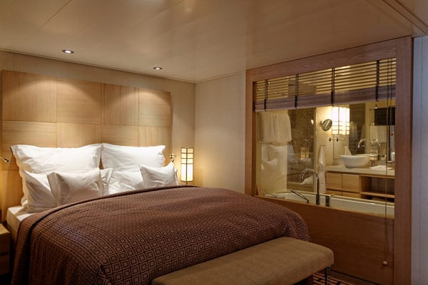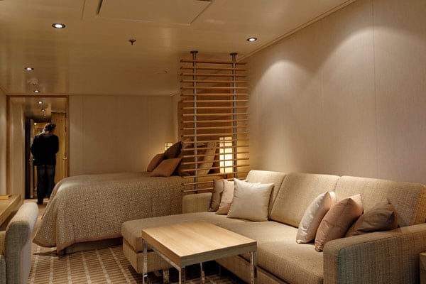 Und auch bei der Spa Suite fallen wieder die kleinen, aber so komfortablen Details auf. Beispiel: Die Betten haben Standardlänge – doch ist ein Passagier besonders groß, nutzt er in den Spa- und Grand-Suiten einfach die Sitzbank am Fußende des Betts noch mit – sinnvollerweise ist die nämlich auf exakt derselben Höhe wie die Matratze des Betts.