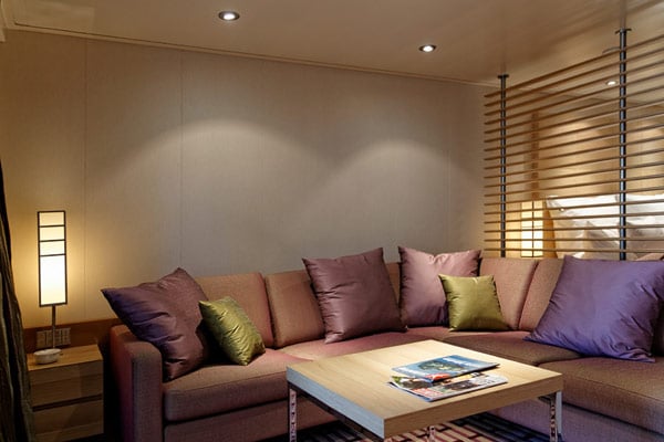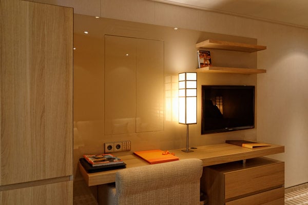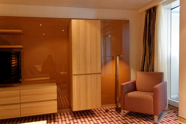 Apropos Schalter: Lichtschalter gibt es in den Suiten einige. Denn je nach Laune kann der Europa-2-Passagier die Lichtstimmung in seiner Suite recht individuell regeln und zwischen vier typischen Standard-Einstellungen per Knopfdruck wechseln und mit dem Master-Schalter auch sämtliche Lichter mit einem einzigen Knopfdruck ausschalten.