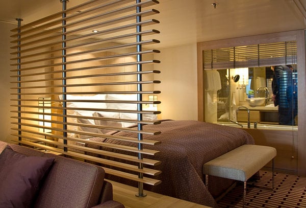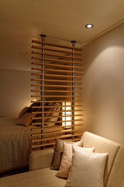 Einem Tester, der die Kabine aus Passagier-Sicht begutachtete, fielen beispielsweise die Holz-Kugeln am Ende der Jalousien-Schnüre in den Spa-Suiten auf: Bei Seegang hätten die gegen die Holzverkleidung des Fensterrahmens zwischen Bad und Wohnraum geschlagen und den Passagier womöglich um seinen Schlaf gebracht. Also bekamen die Holzkugeln zusätzlich feine Gummi-Profile, damit sie auch bei Seegang geräuschlos ihren Zweck erfüllen.