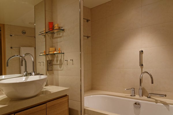 Regendusche und Dampfsauna im Badzimmer sowie ein großes Fenster vom Bad zum Wohnbereich für Tageslicht im Bad machen den Reiz der 16 Spa-Suiten aus. Die Badewanne bietet einen integrierten Whirlpool und wer will, kann im Badezimmer-Spiegel sogar fernsehen.