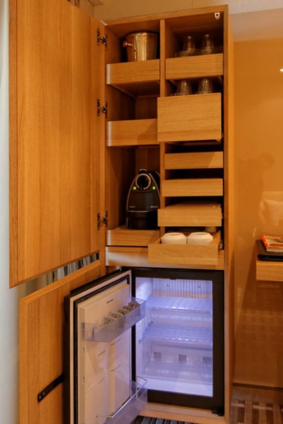 Bei genauerem Hinsehen fällt vor allem die Liebe zu Detail auf. Der Minibar-Schrank ist ein kleines Kunstwerk für sich und ein Platzwunder: Kaffeemaschine, Kaffee- und Tee-Tassen, Wasser- und Champagner-Gläser und natürlich der Minibar-Kühlschrank selbst finden hier Platz. Wenn die Europa 2 in Betrieb geht, ist die Minibar mit Bier und Softdrinks kostenfrei gefüllt. In höheren Suiten-Kategorien sind übrigens auch Spirituosen der Minibar im Preis inklusive.